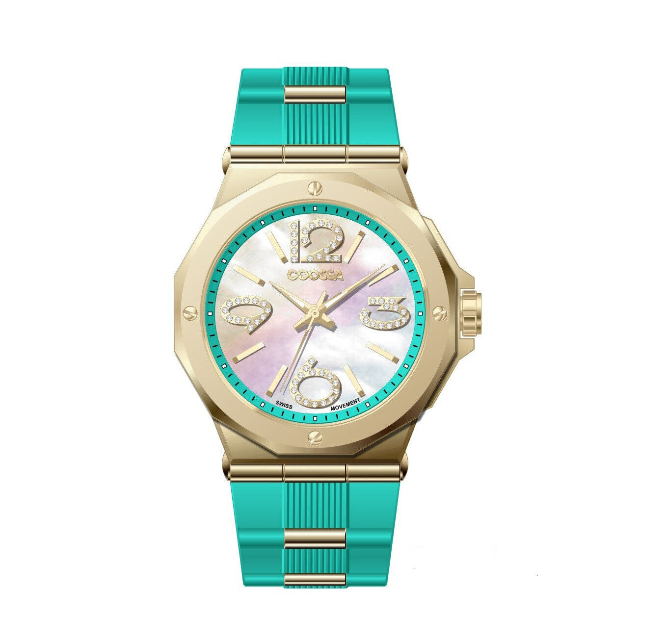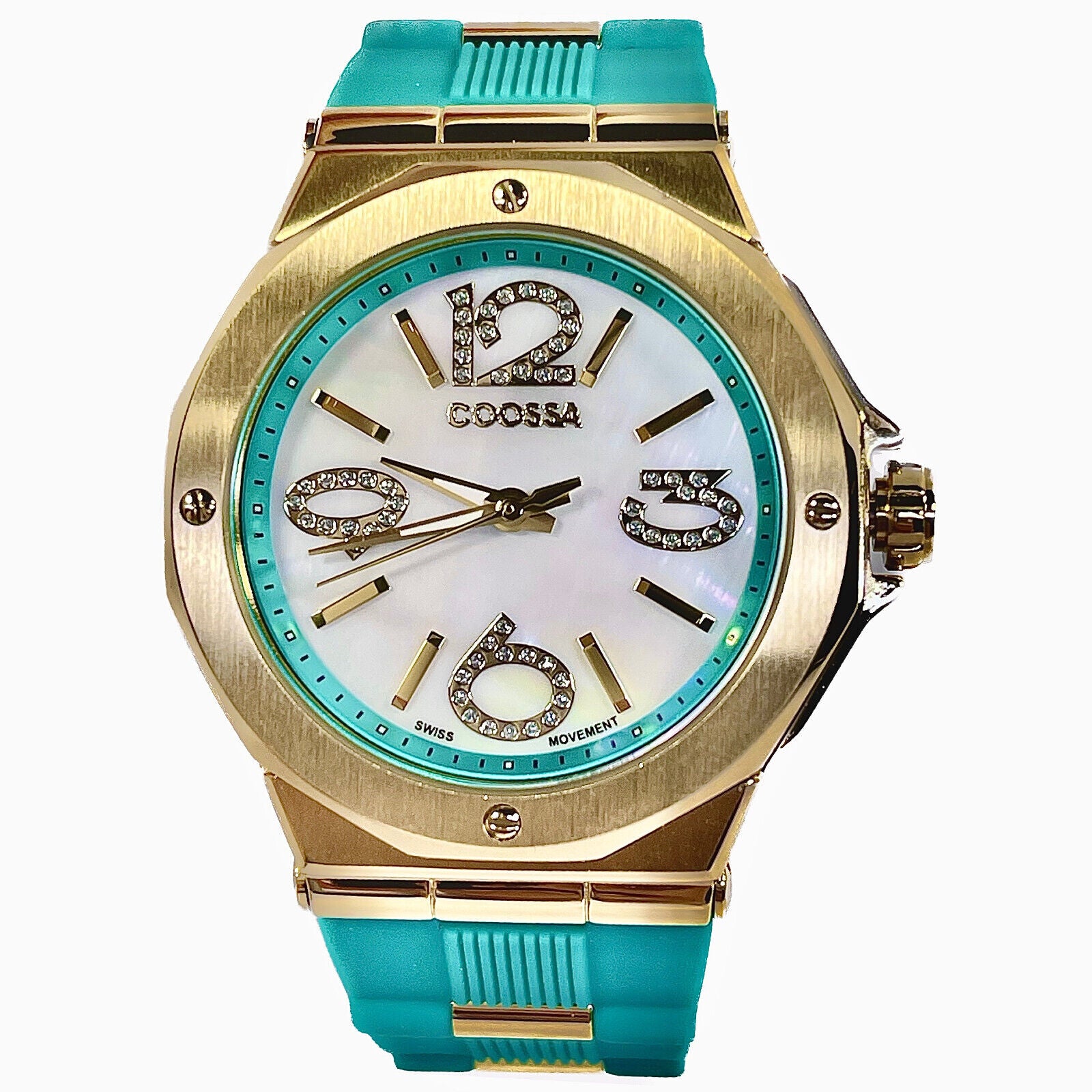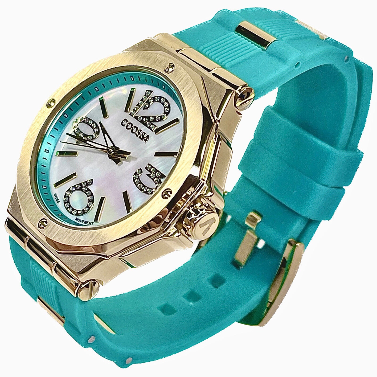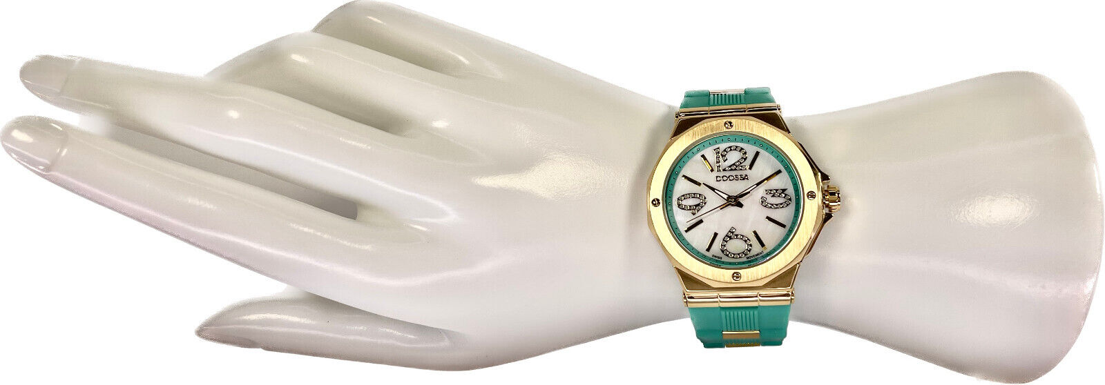 COOSSA ORIGINAL First Edition 20249 Women's Watch Swiss Ronda Movement Mother of Pearl Dial 36.5MM Stainless Steel Case 100M Water Resistant Green/Gold Tone