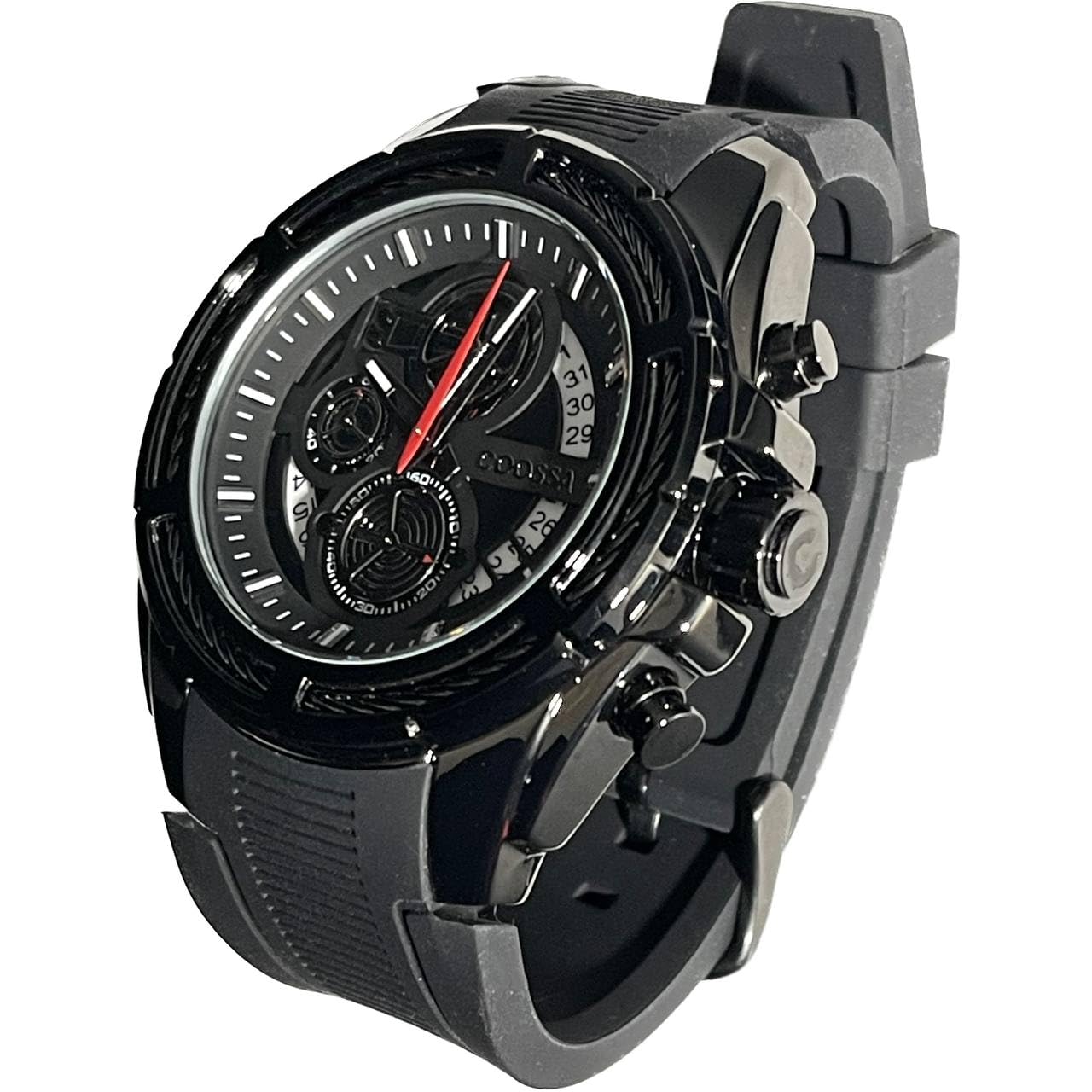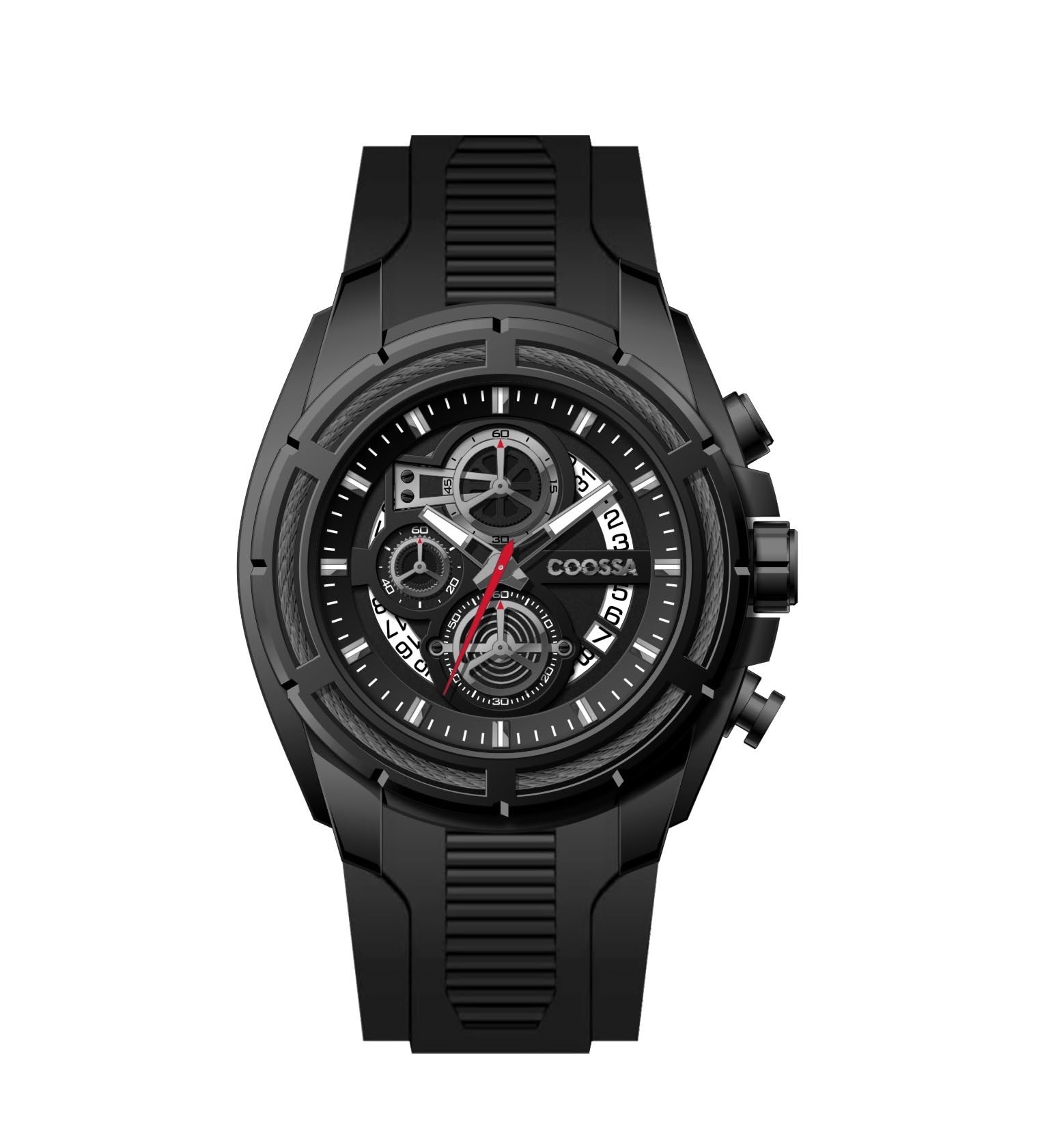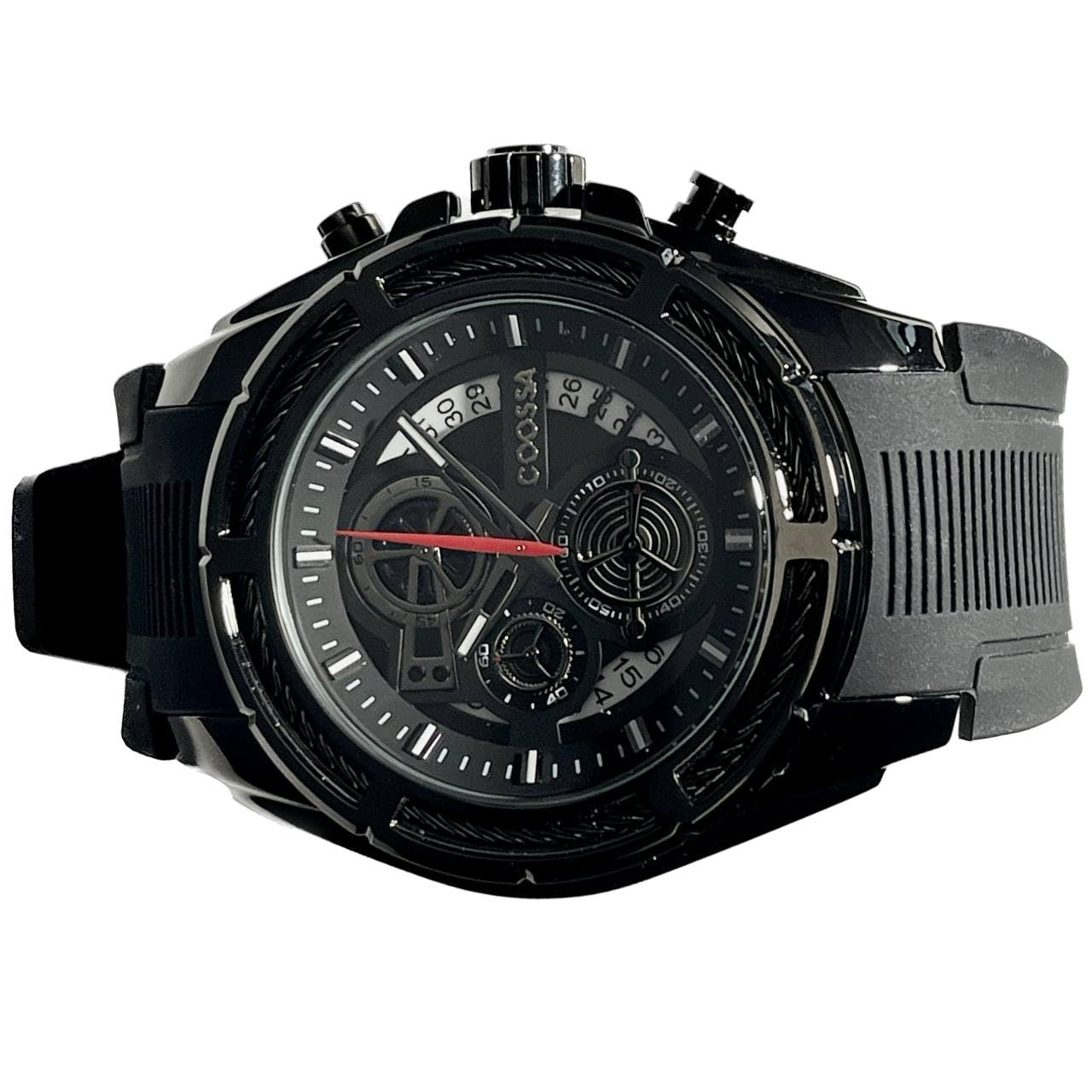 COOSSA ORIGINAL Men's Watch Chronograph 20232 48MM Polished Black Tone Case Black Silicone Band 30M Water Resistant Cable Bezel