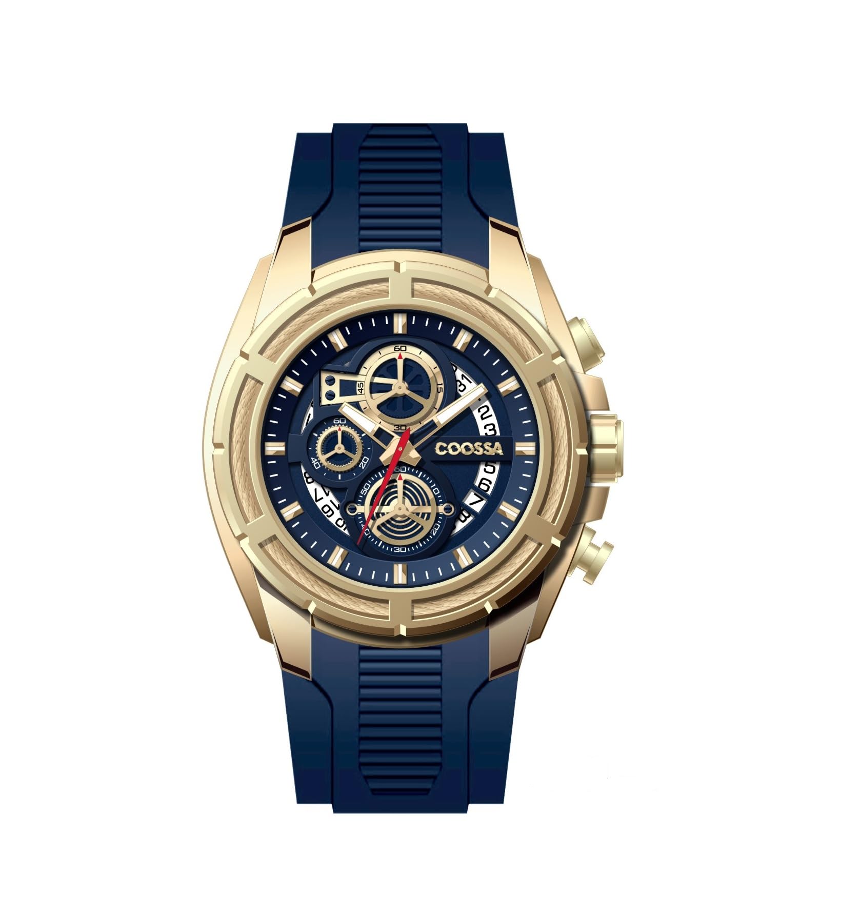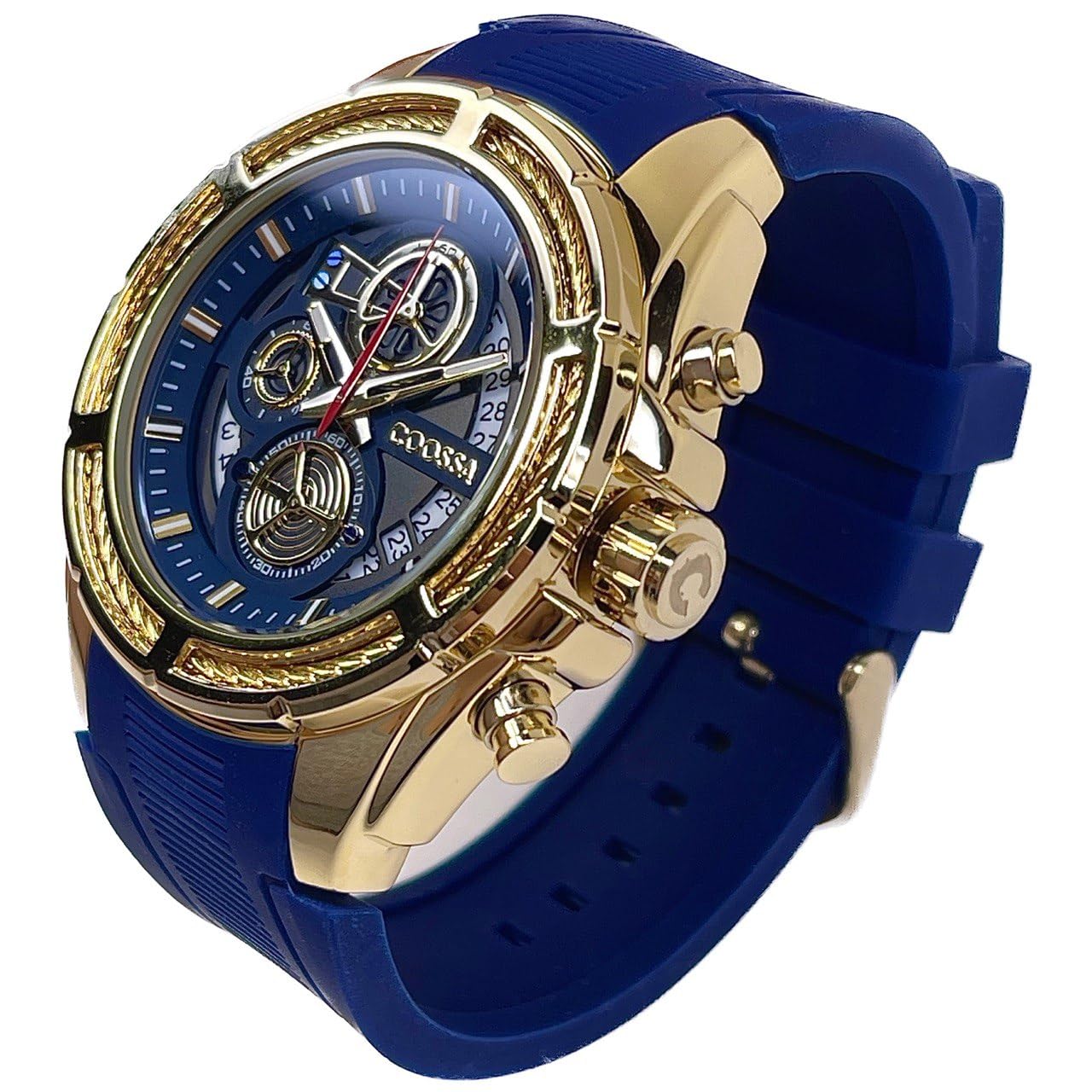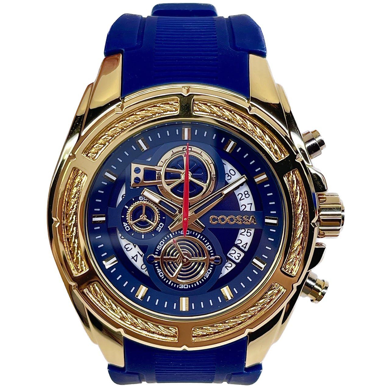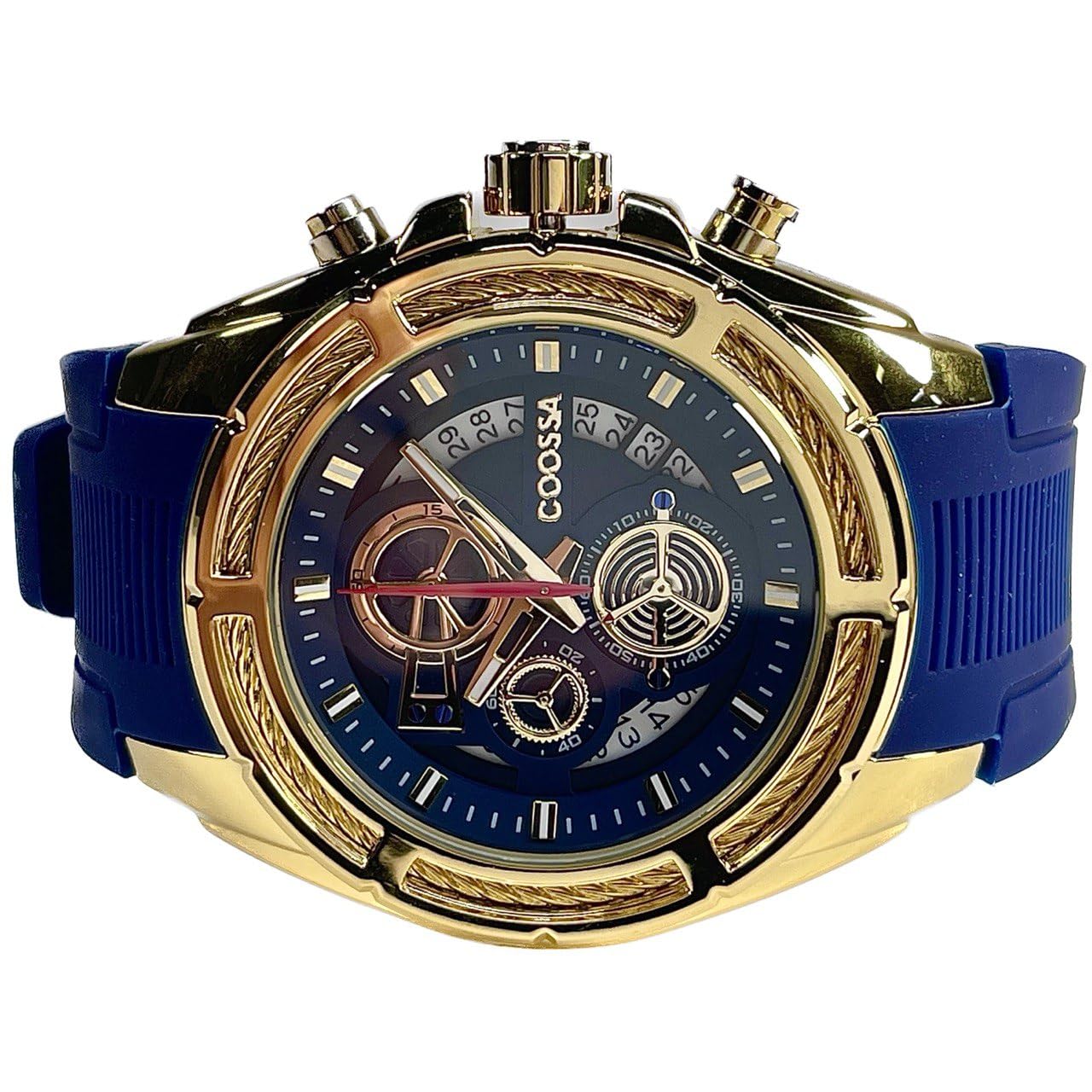 COOSSA ORIGINAL Men's Watch Chronograph 20234 48MM Gold Tone Case Blue Silicone Band 30M Water Resistant Cable Bezel
