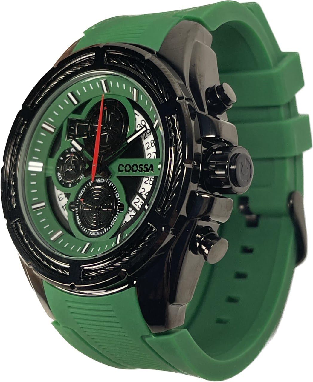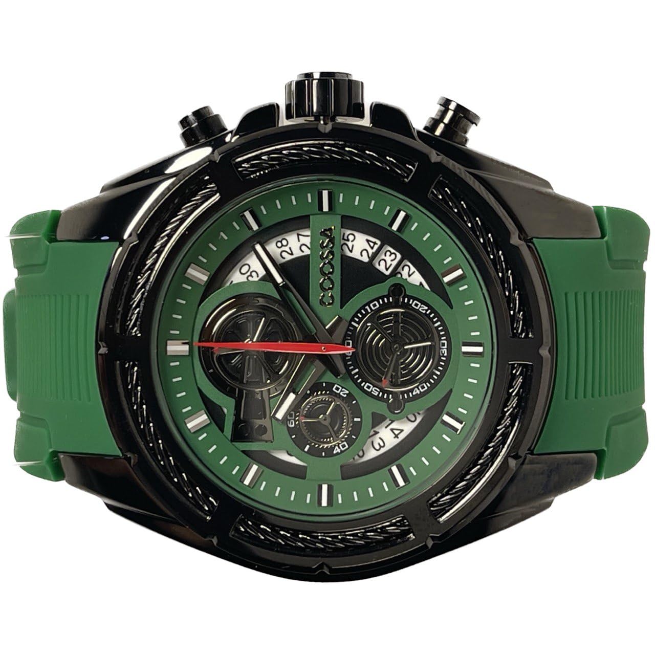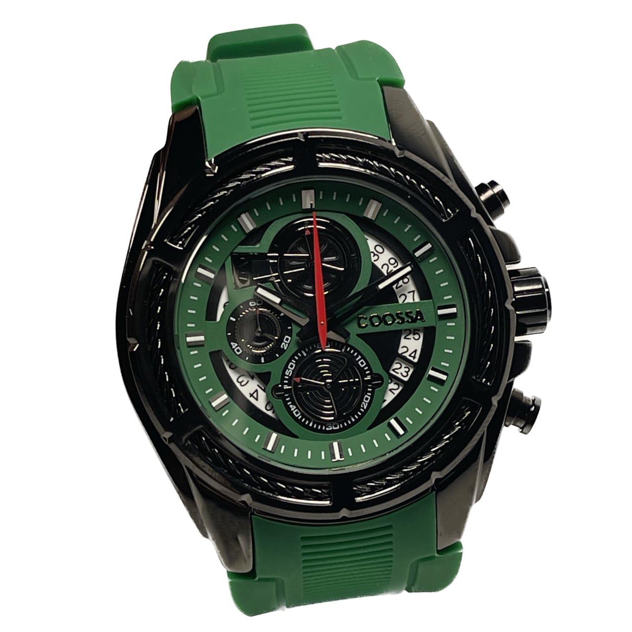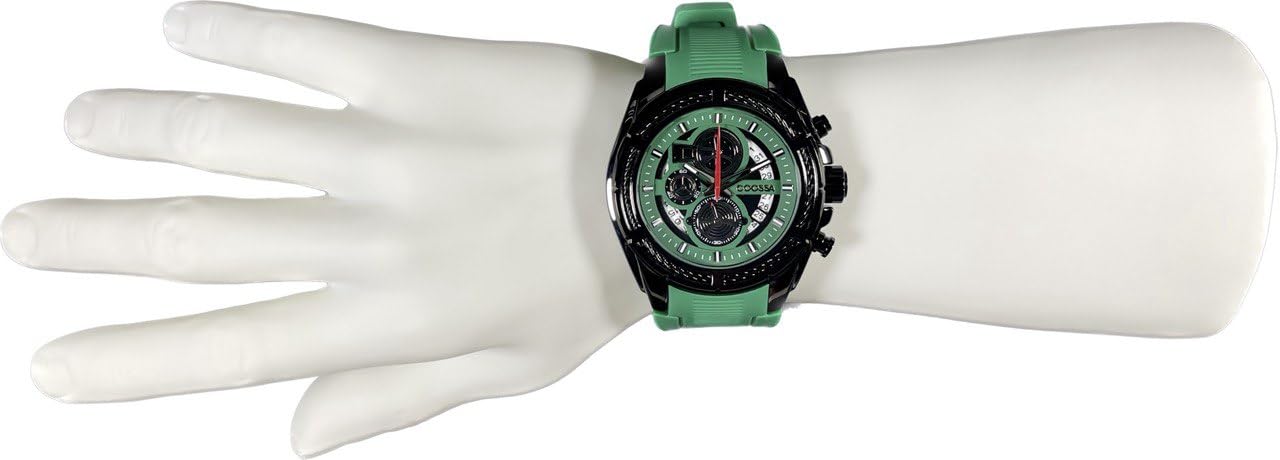 COOSSA ORIGINAL Men's Watch Chronograph 20235 48MM Black Tone Case Green Silicone Band 30M Water Resistant Cable Bezel
