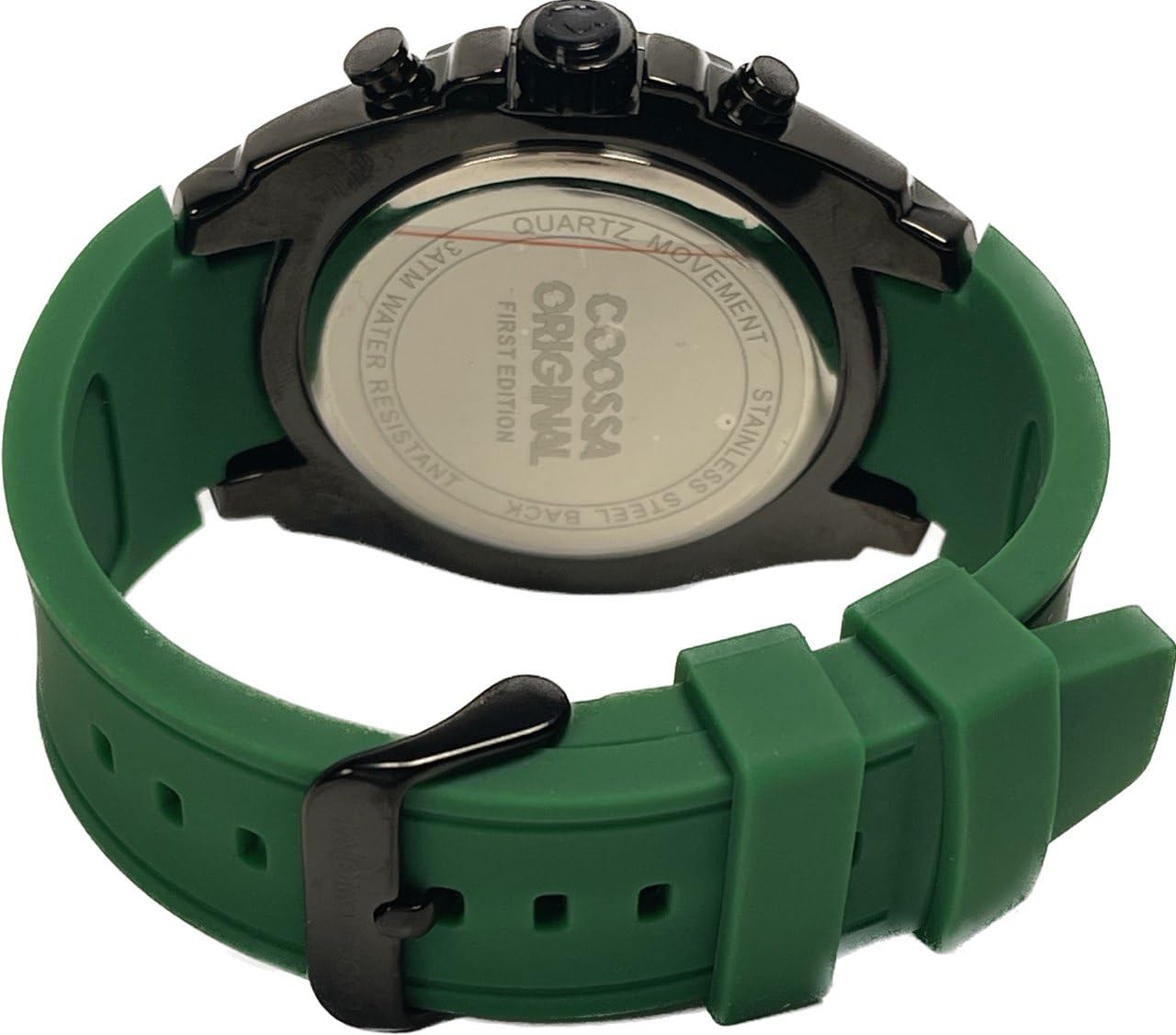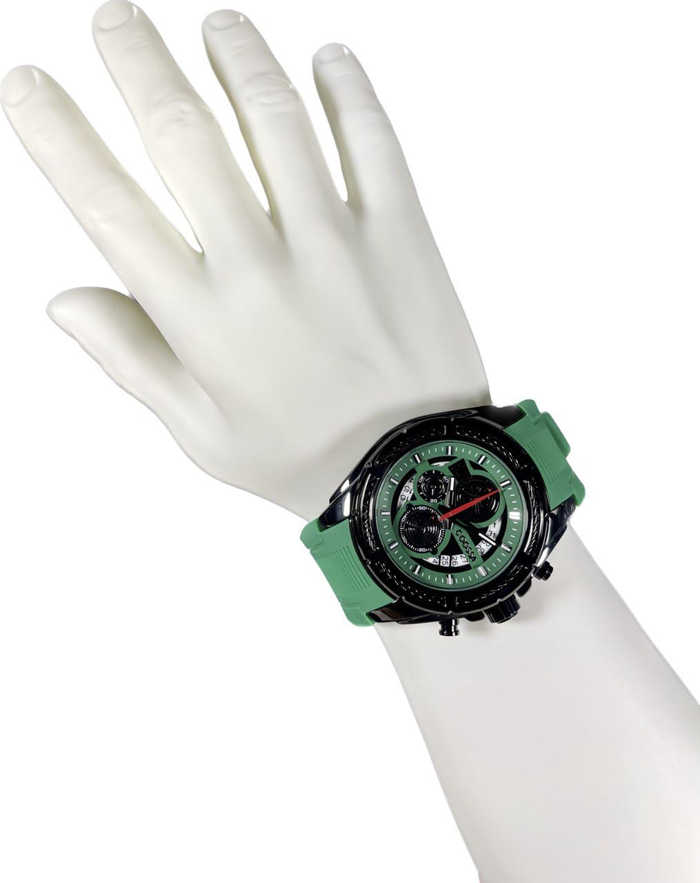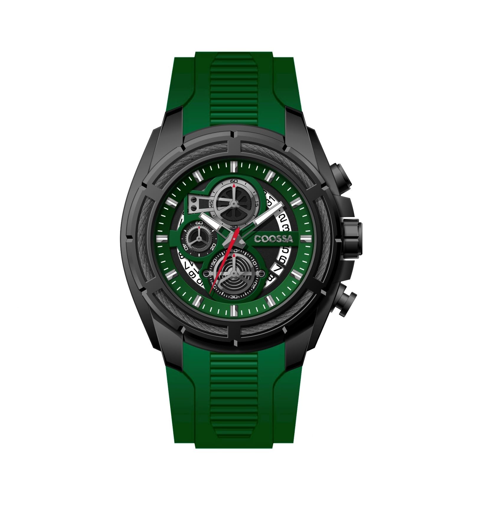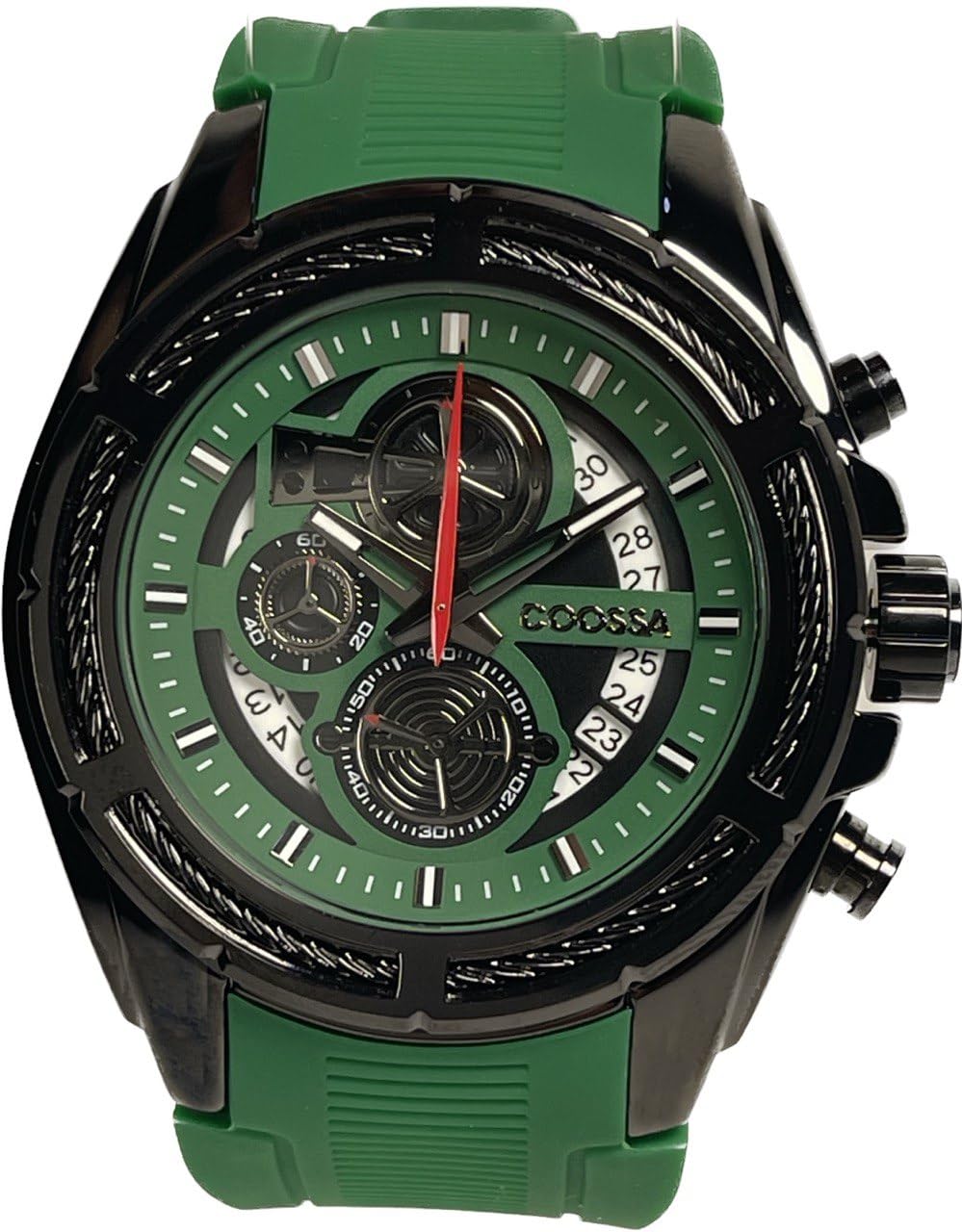 COOSSA ORIGINAL Men's Watch Chronograph 20235 48MM Black Tone Case Green Silicone Band 30M Water Resistant Cable Bezel