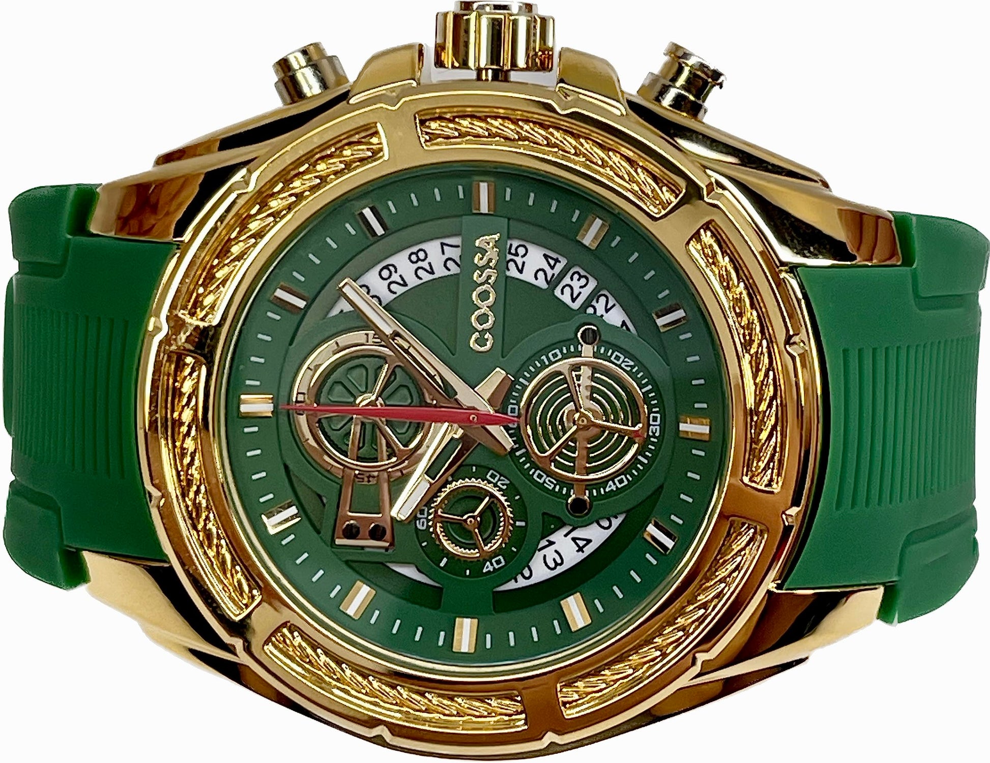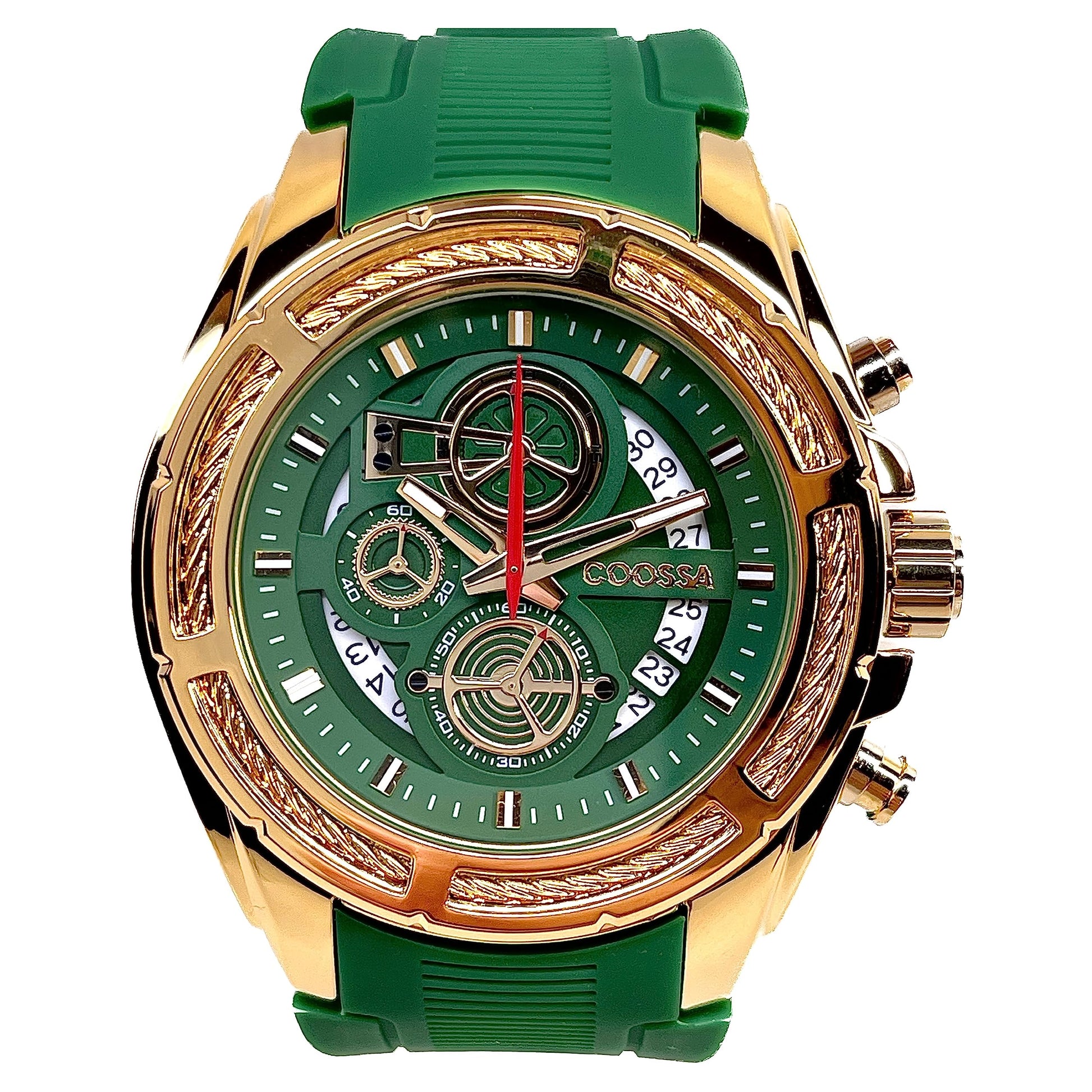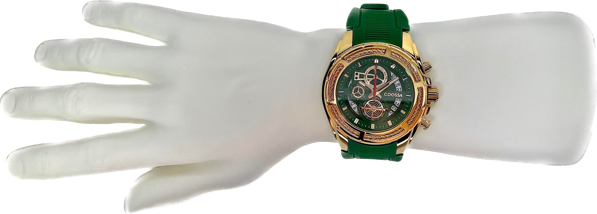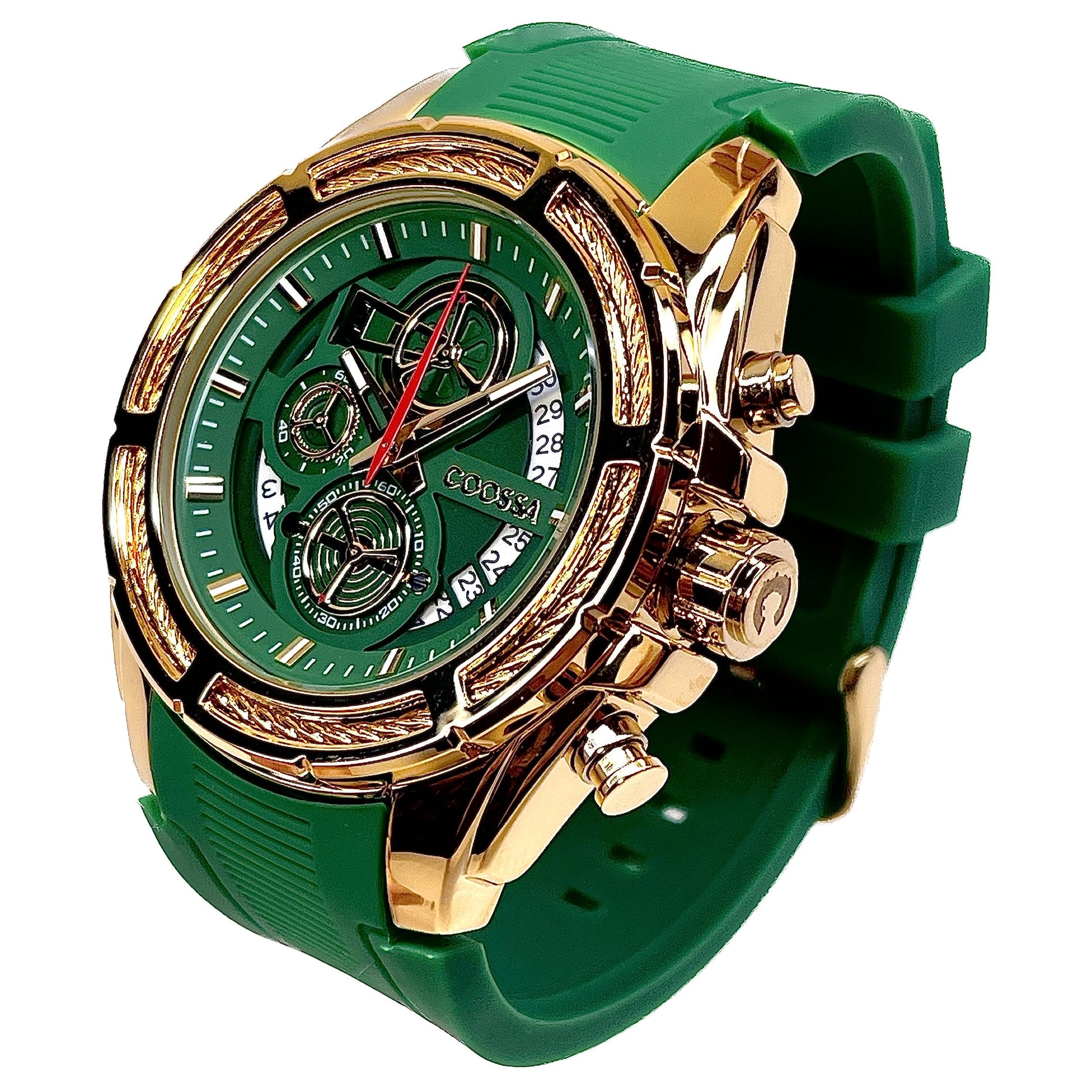 COOSSA ORIGINAL Men's Watch Chronograph 20236 48MM Gold Tone Case Green Silicone Band 30M Water Resistant Cable Bezel