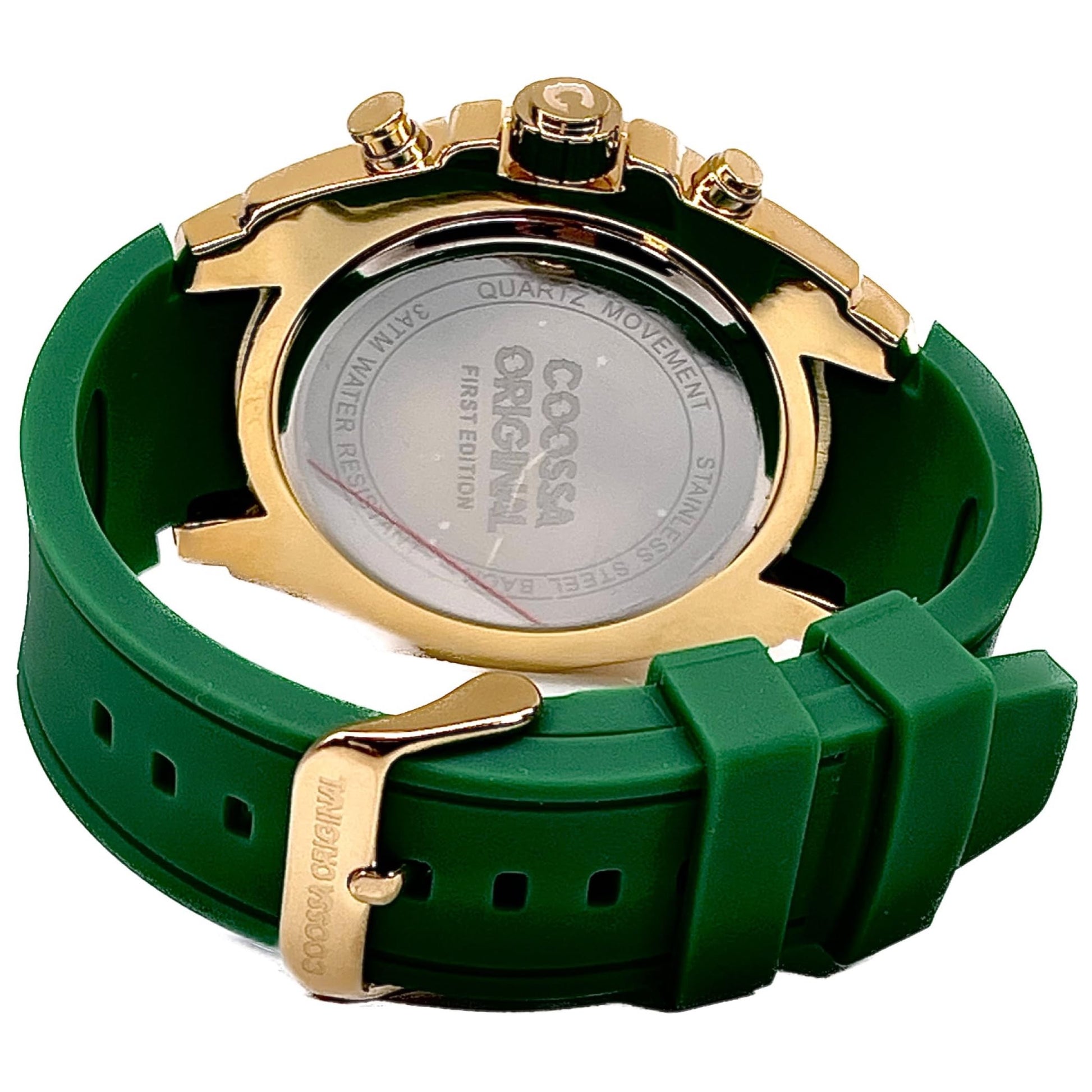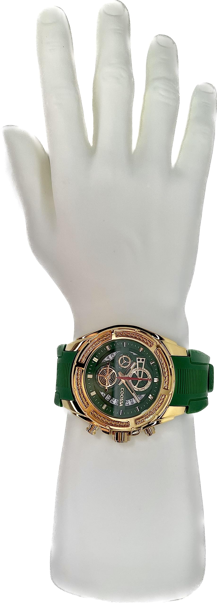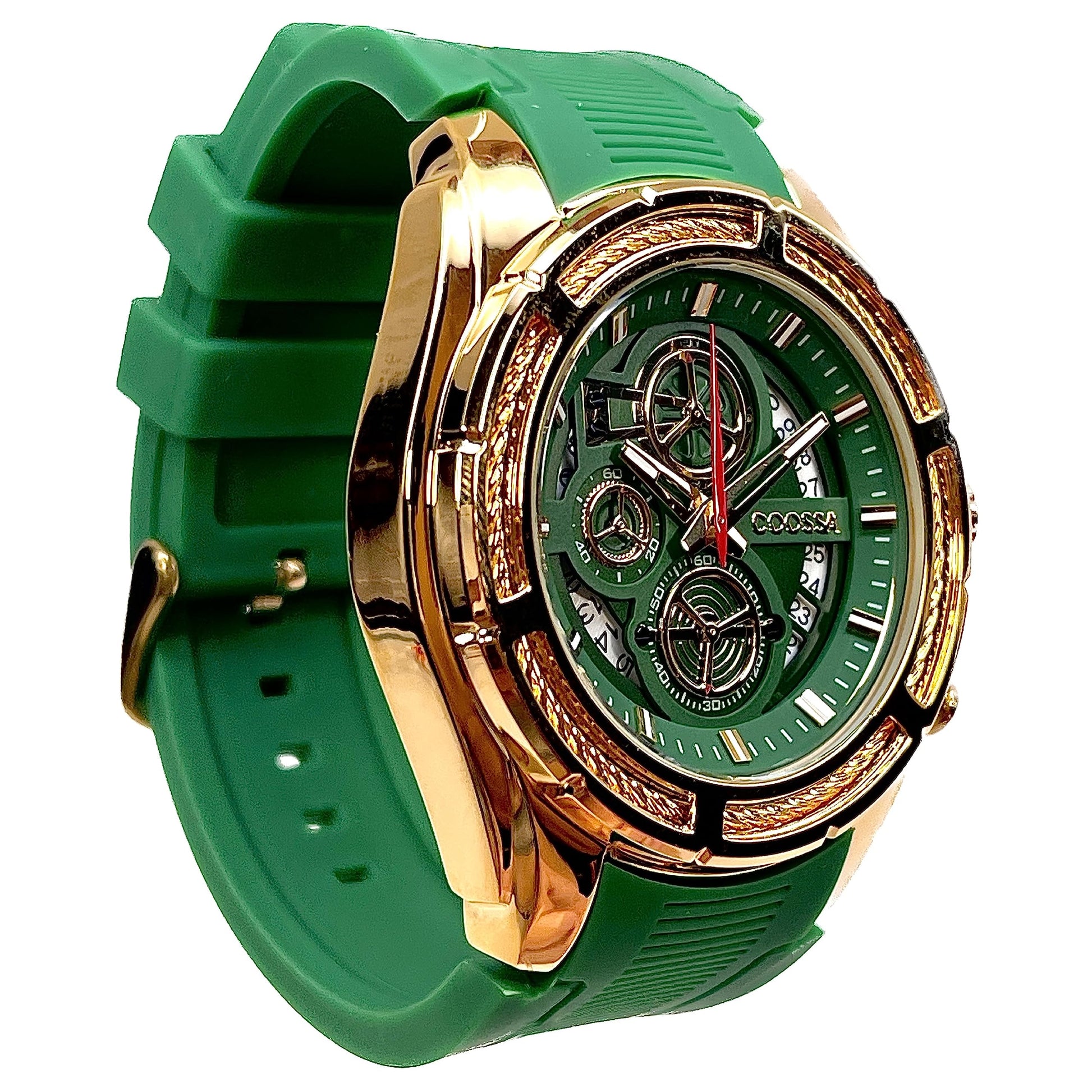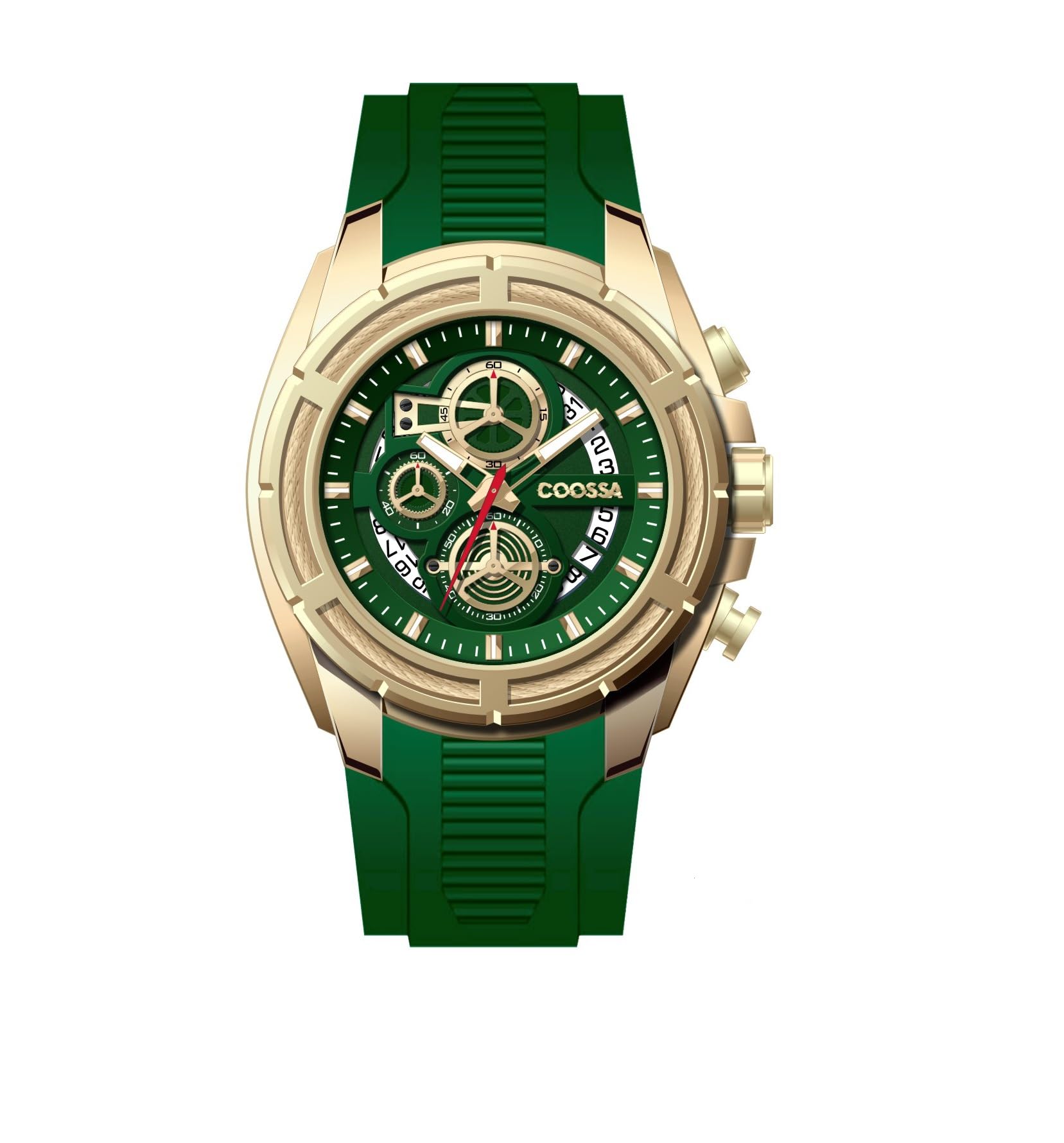 COOSSA ORIGINAL Men's Watch Chronograph 20236 48MM Gold Tone Case Green Silicone Band 30M Water Resistant Cable Bezel