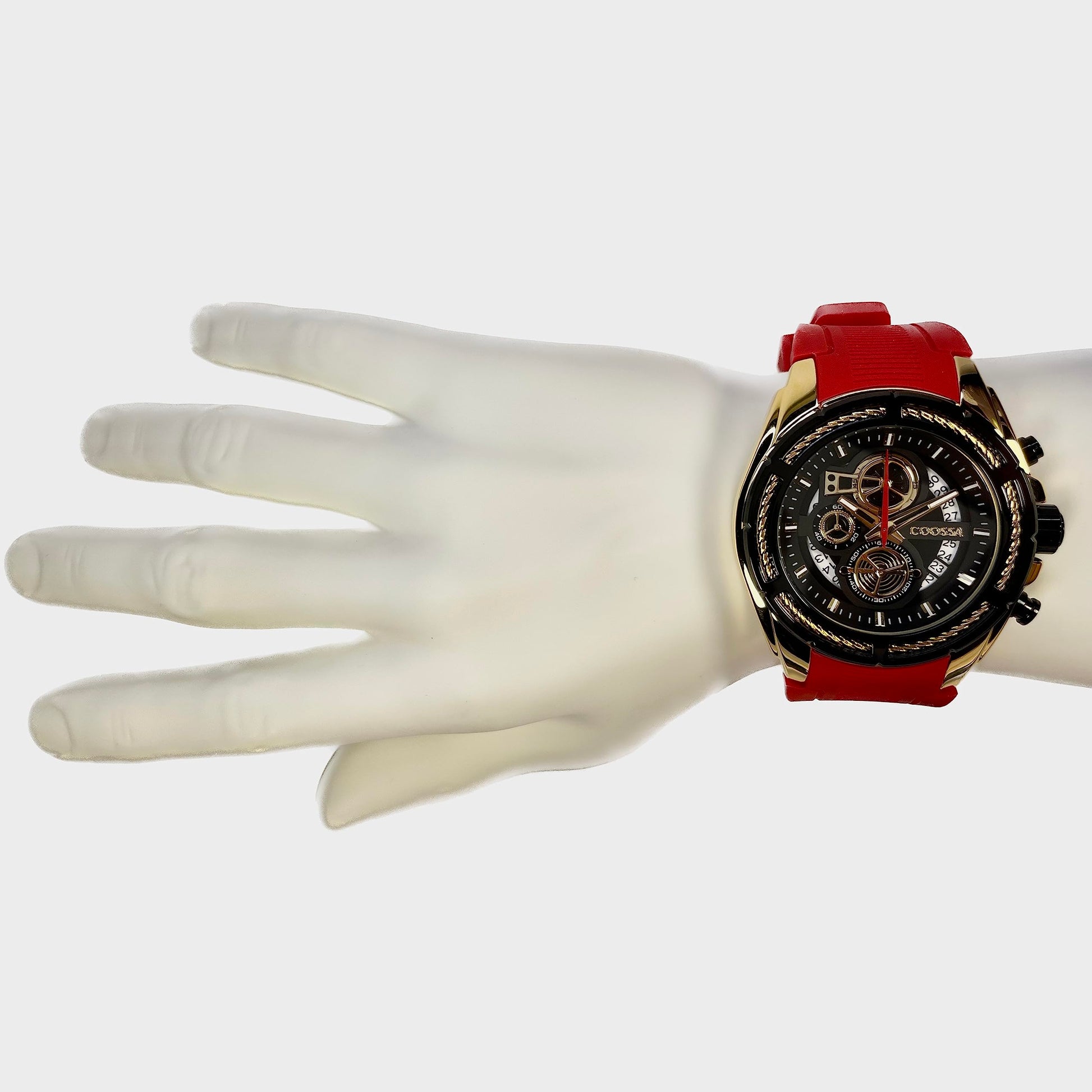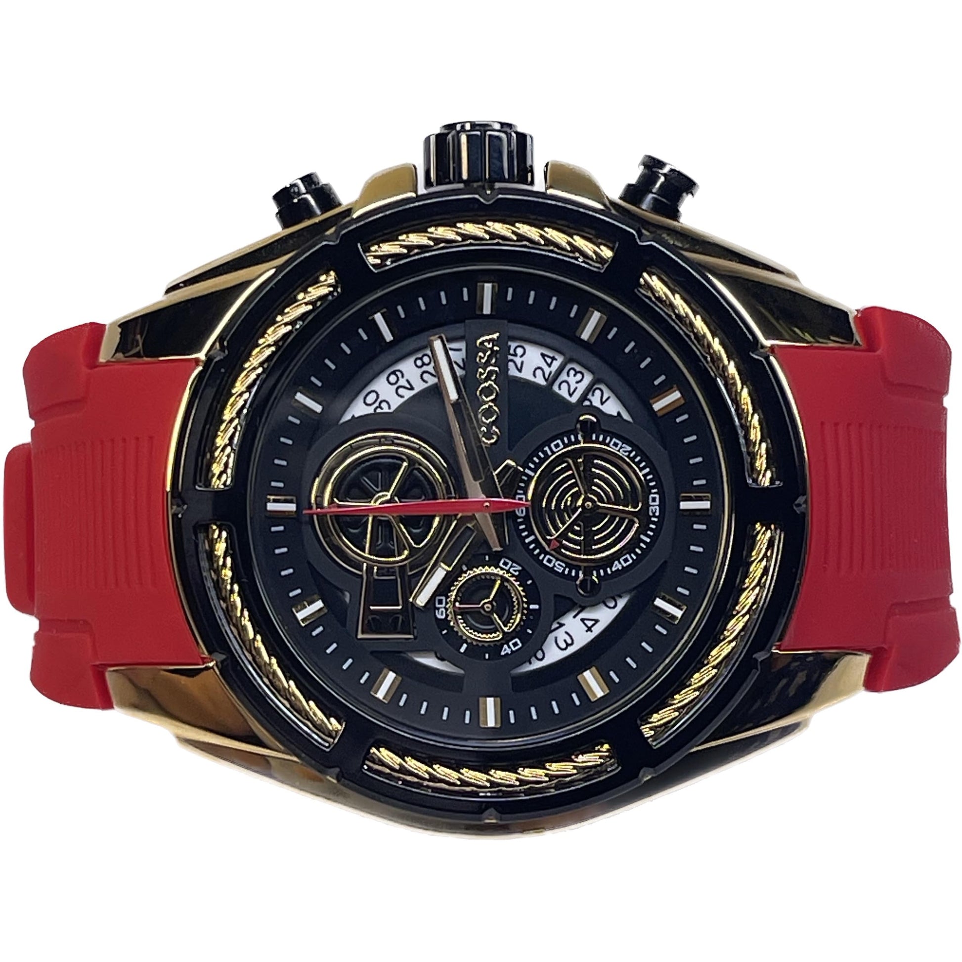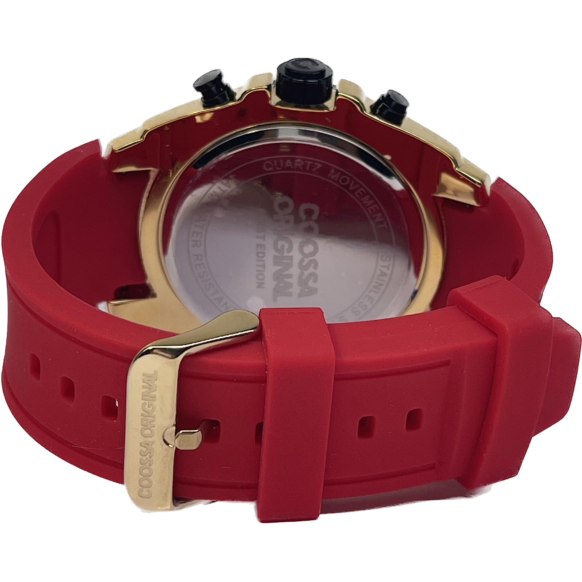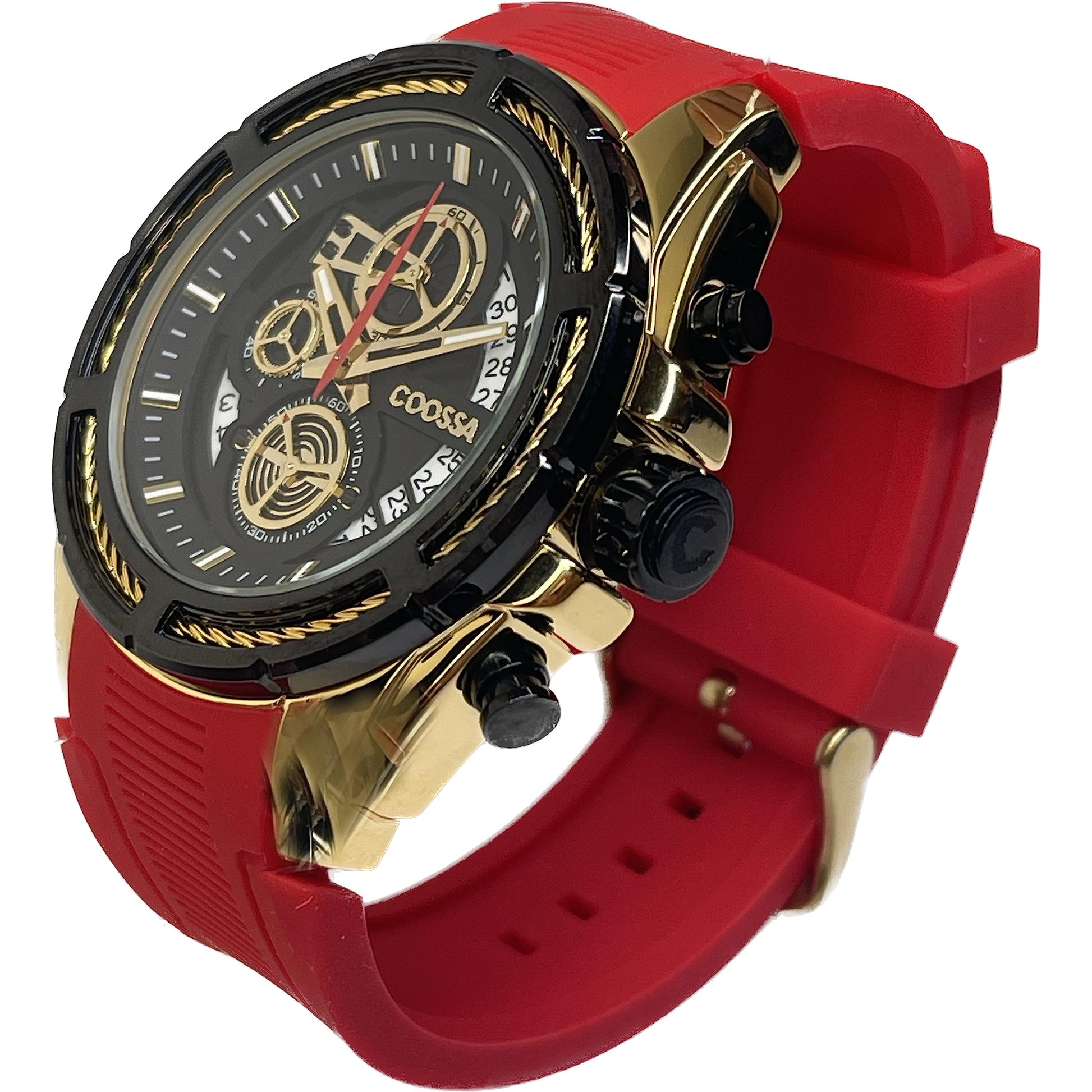 COOSSA ORIGINAL Men's Watch Chronograph 20240 48MM Gold Tone Case Red Silicone Band 30M Water Resistant Cable Bezel
