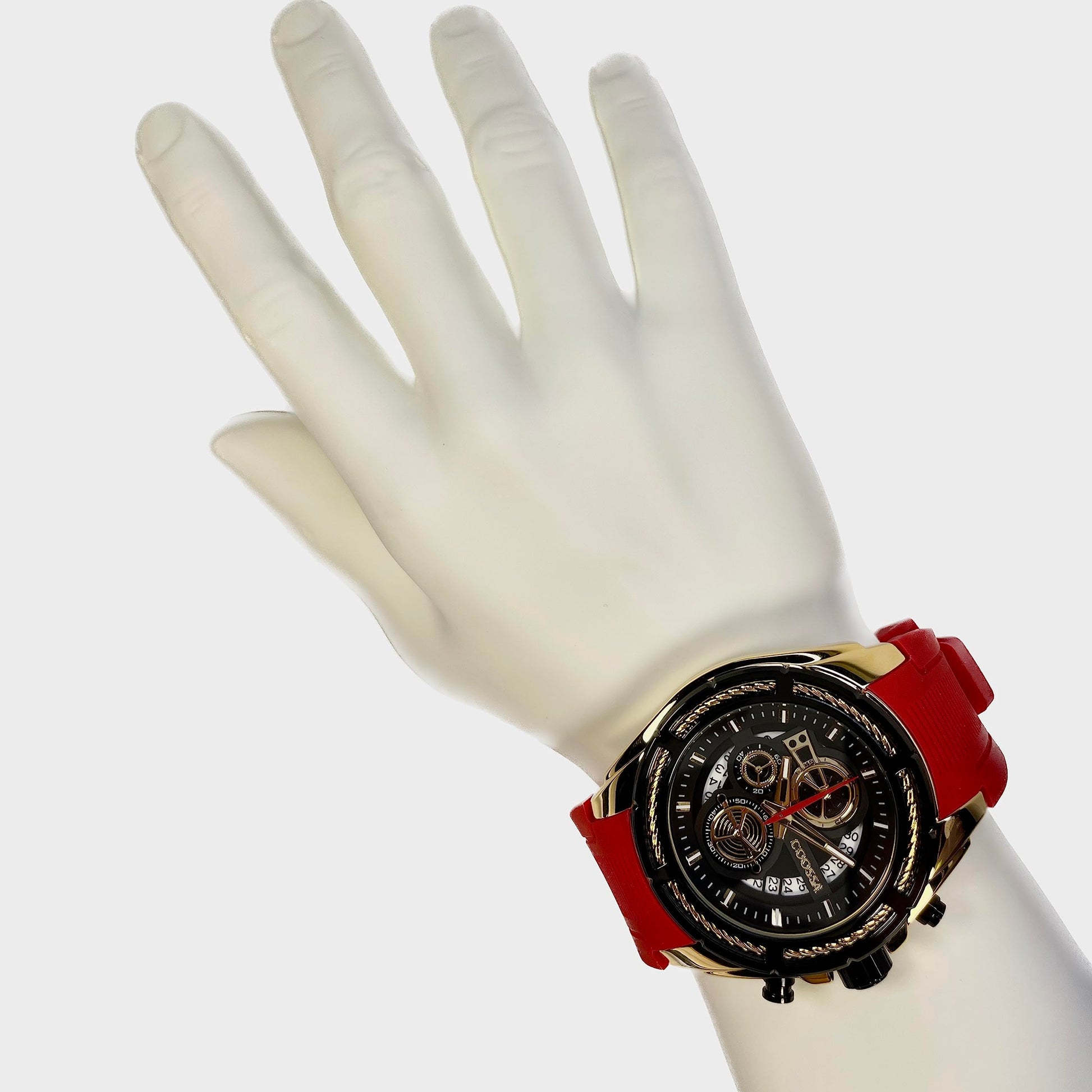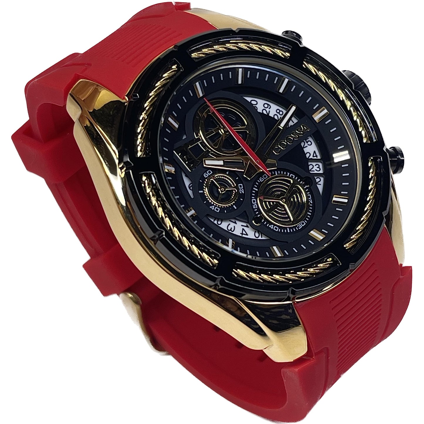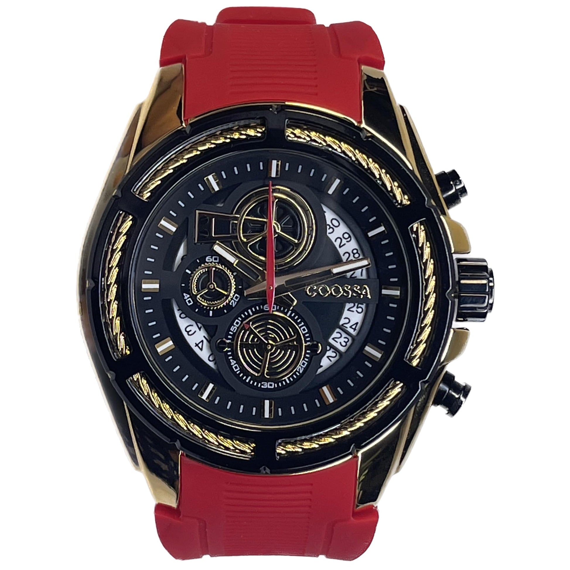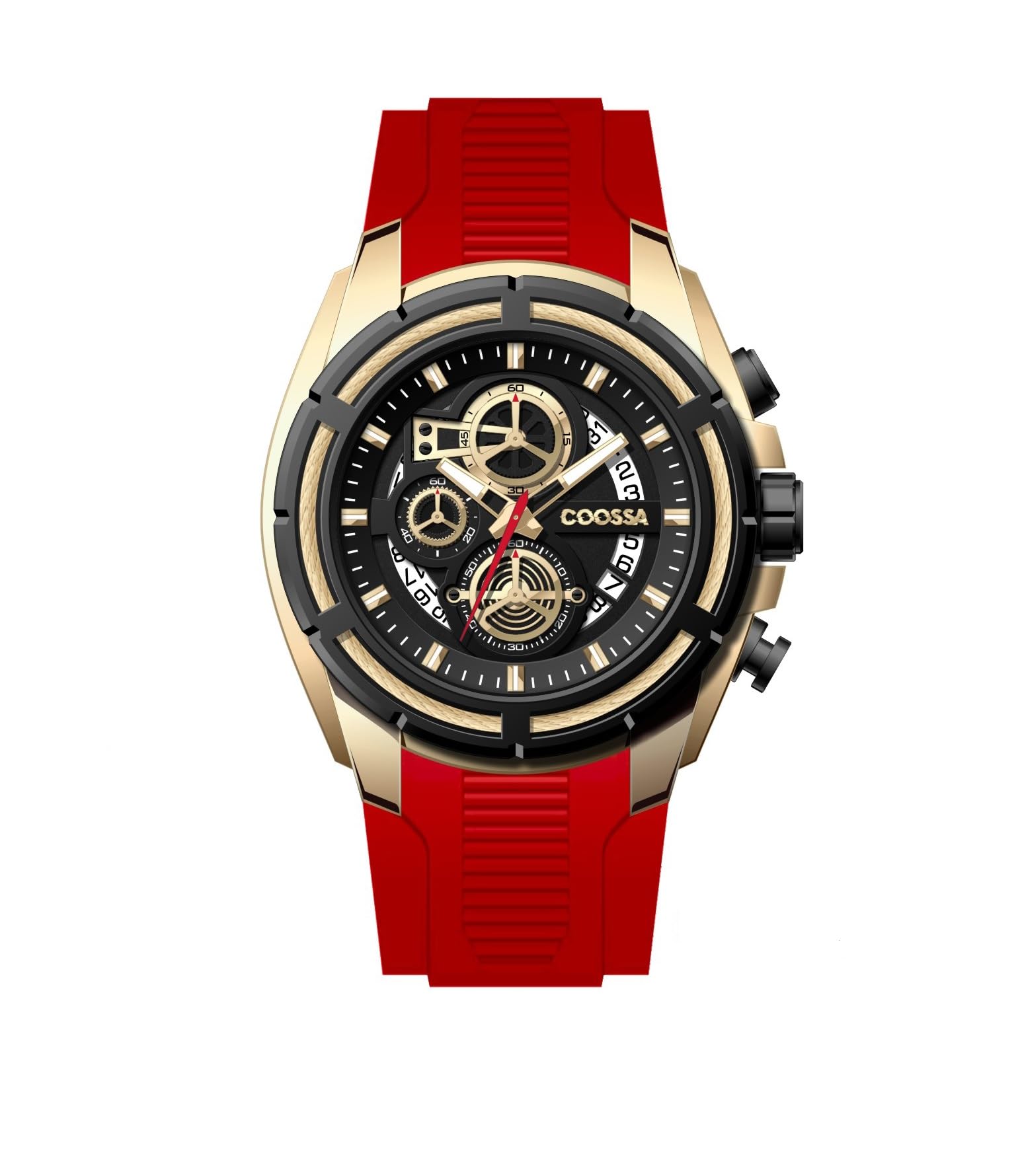 COOSSA ORIGINAL Men's Watch Chronograph 20240 48MM Gold Tone Case Red Silicone Band 30M Water Resistant Cable Bezel