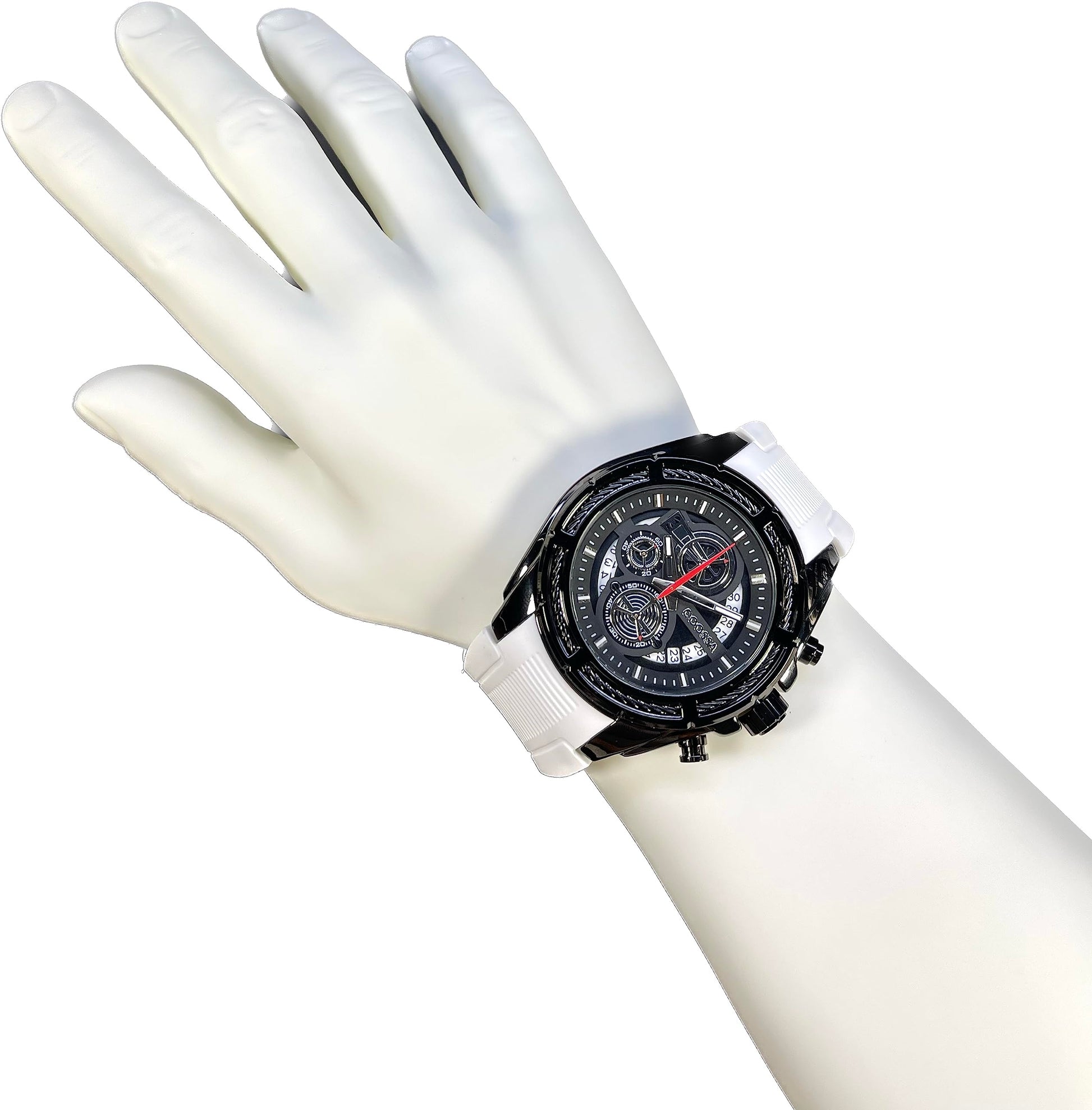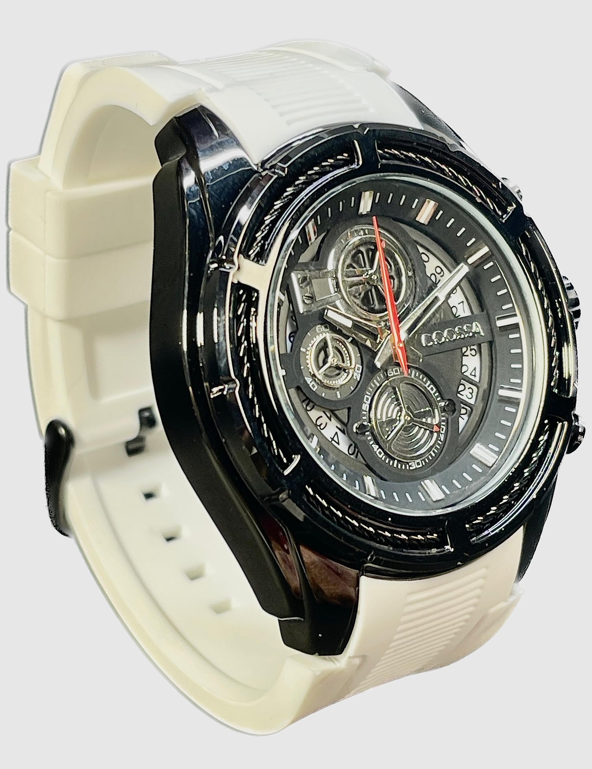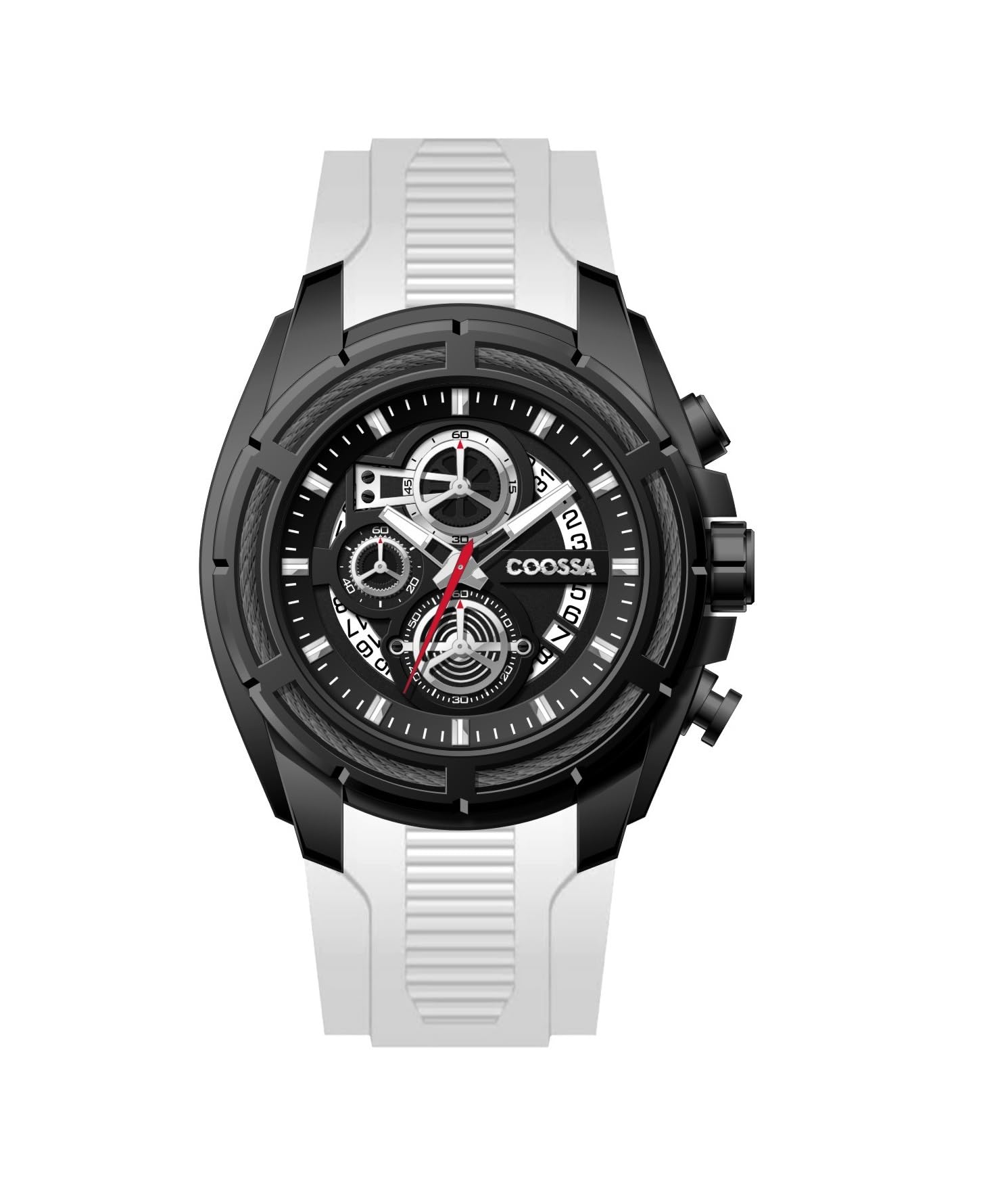 COOSSA ORIGINAL Men's Watch Chronograph 20242 48MM Black Tone Case White Silicone Band 30M Water Resistant Cable Bezel