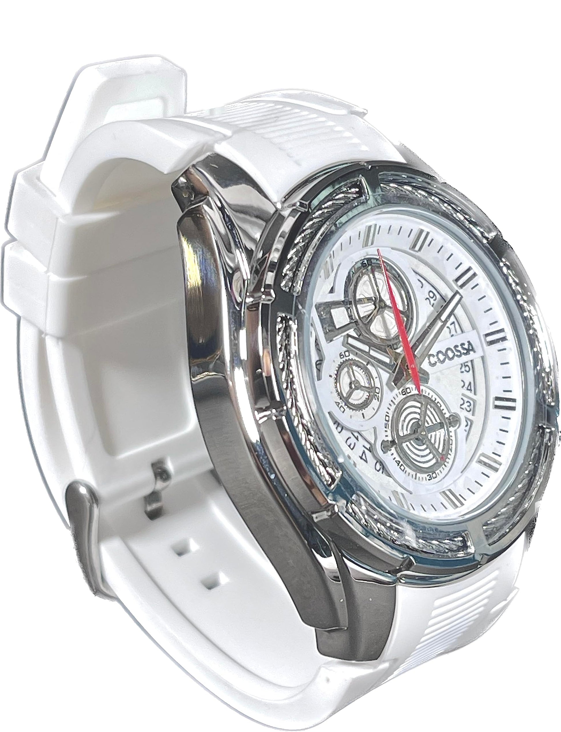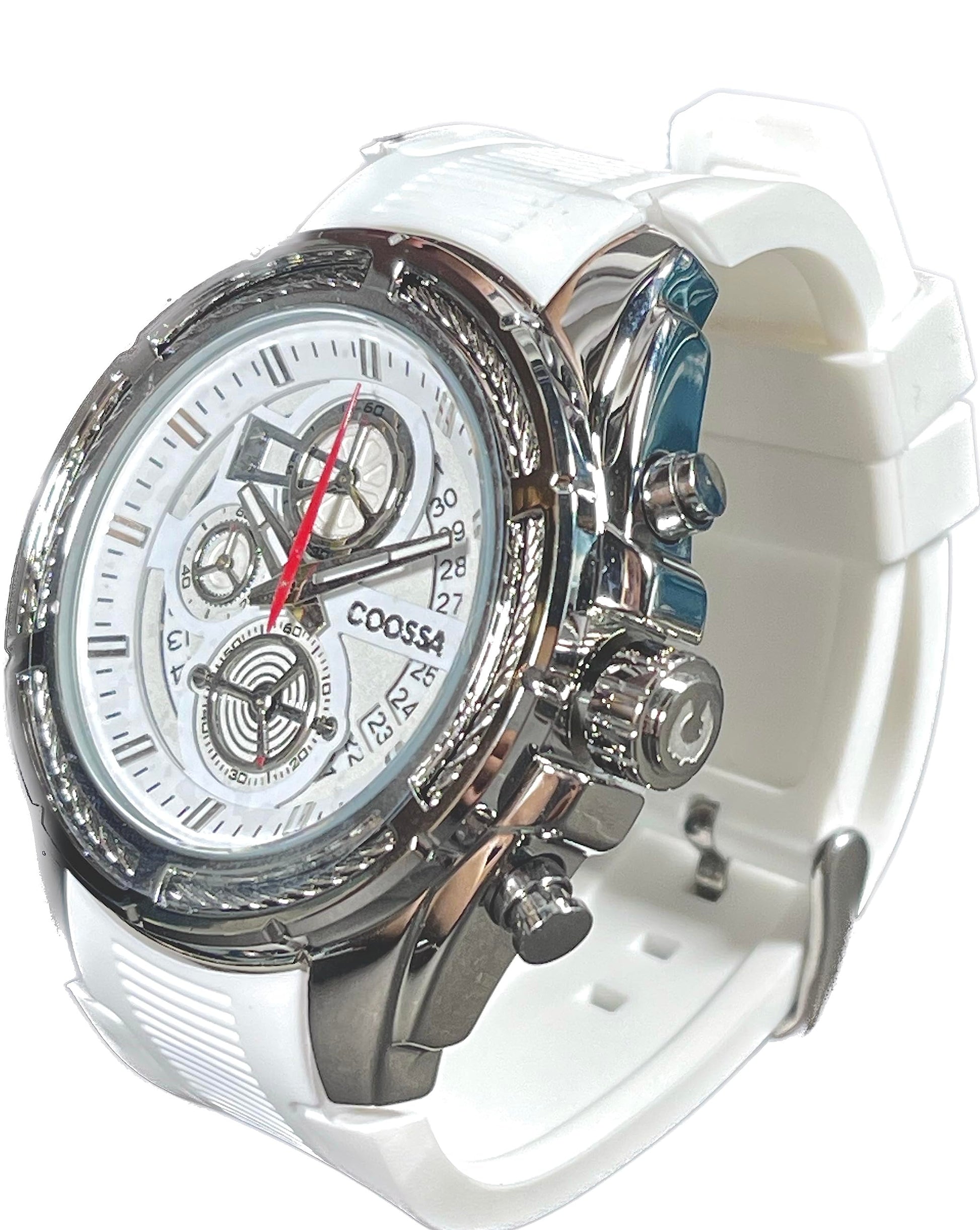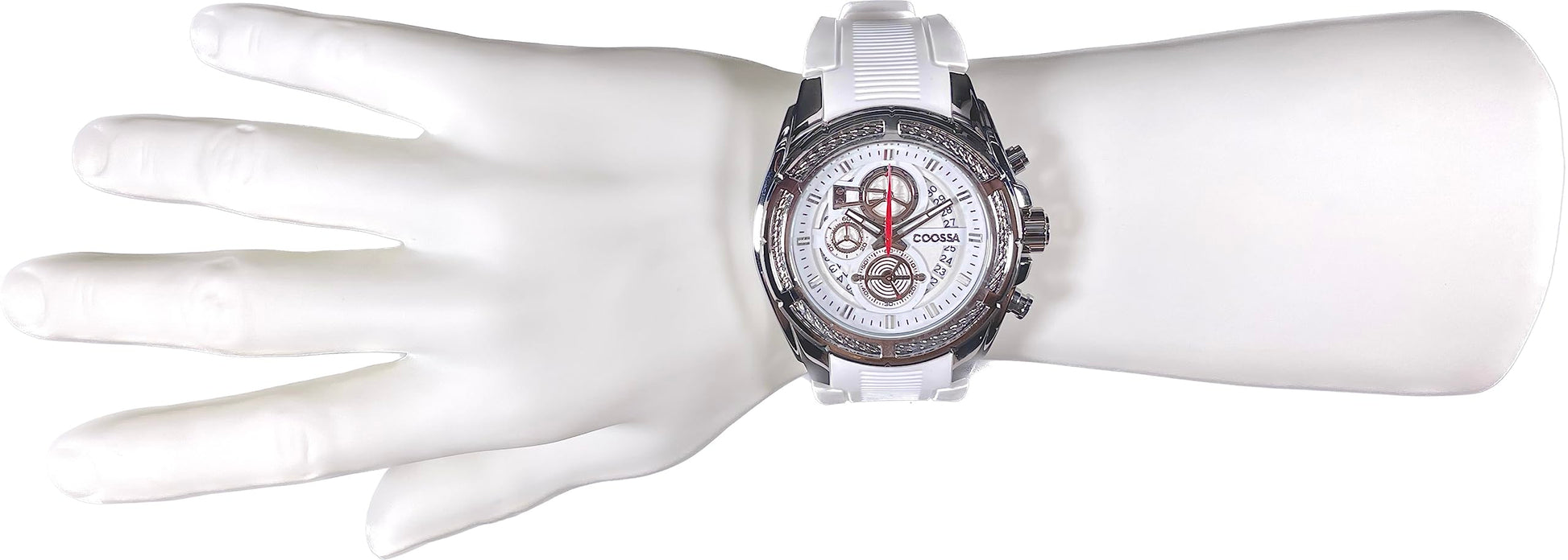 COOSSA ORIGINAL Men's Watch Chronograph 20243 48MM Silver Tone Case White Silicone Band 30M Water Resistant Cable Bezel