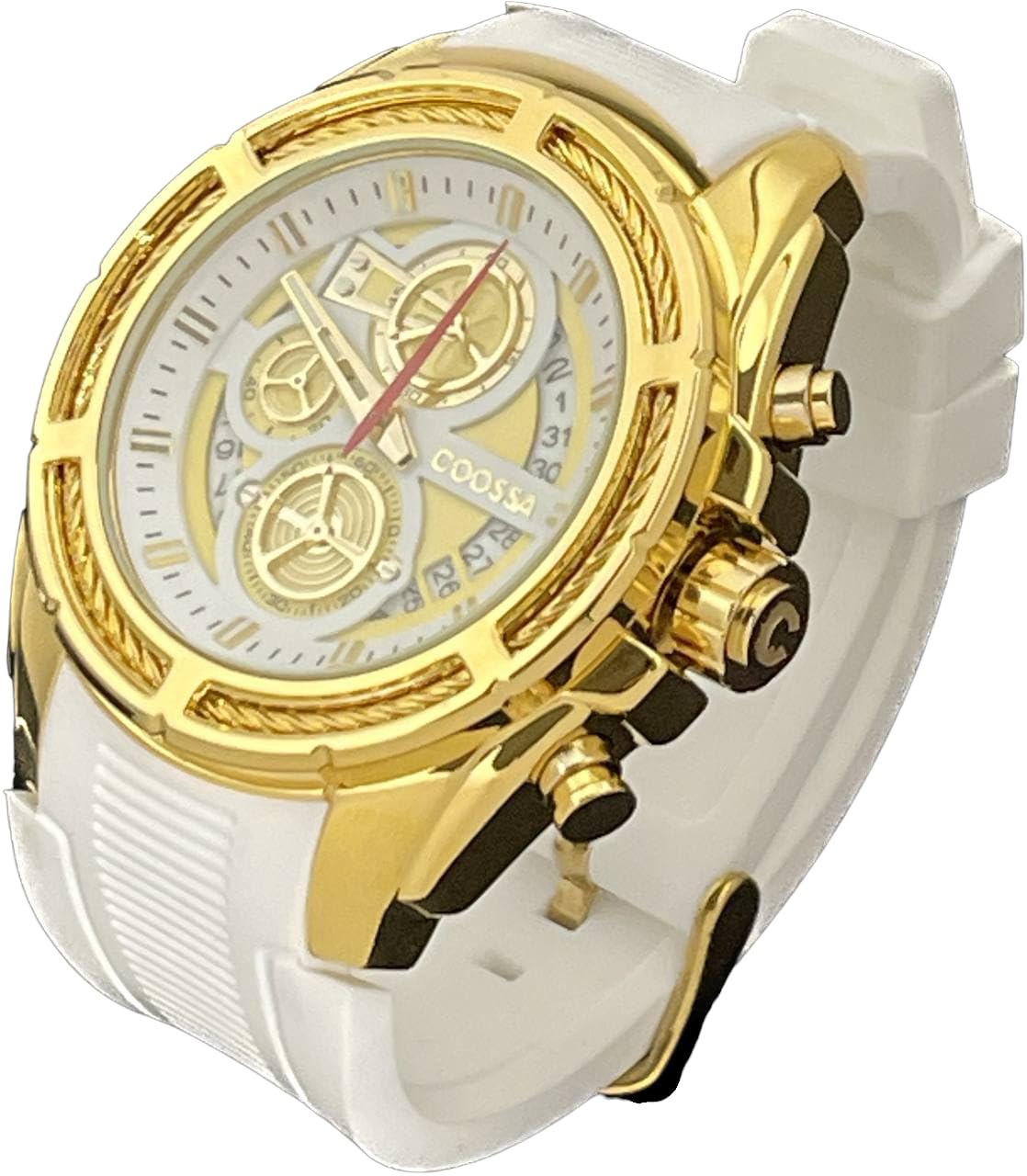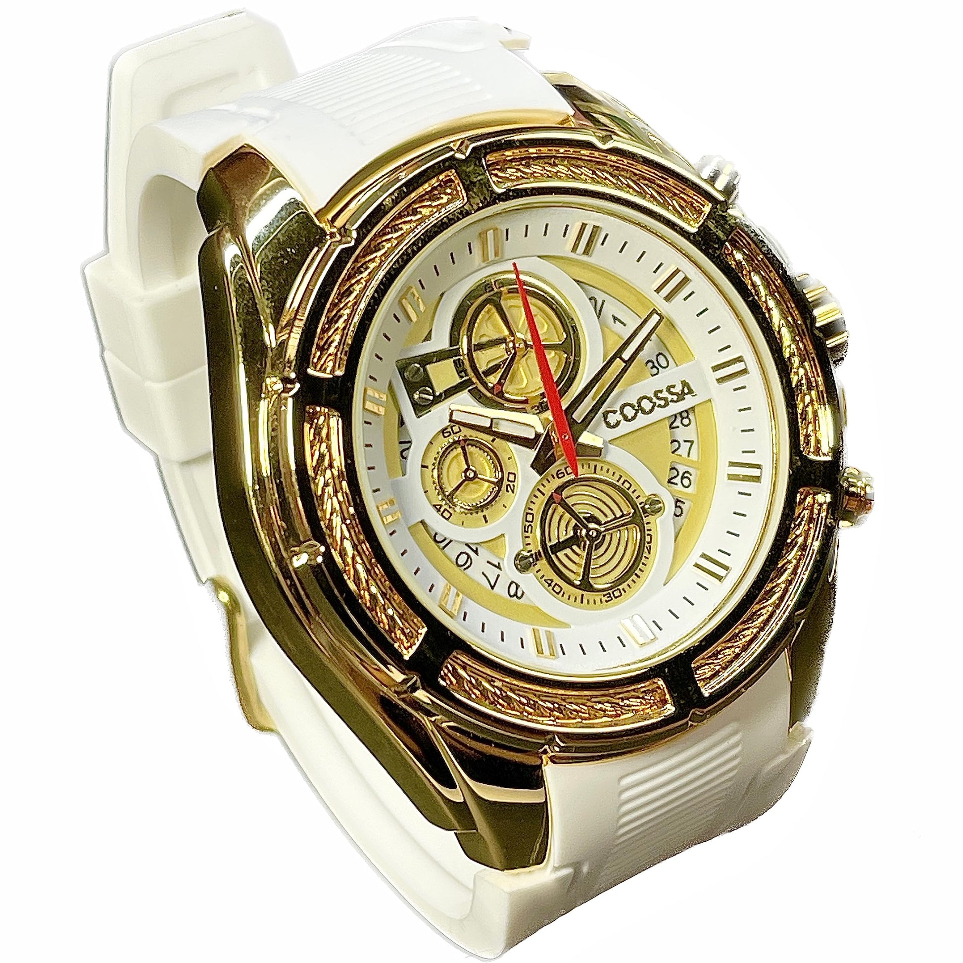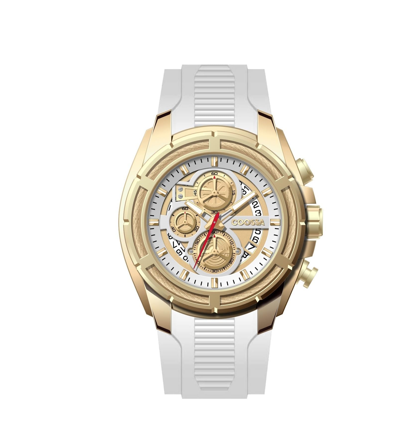 COOSSA ORIGINAL Men's Watch Chronograph 20245 48MM Gold Tone Case White Silicone Band 30M Water Resistant Cable Bezel