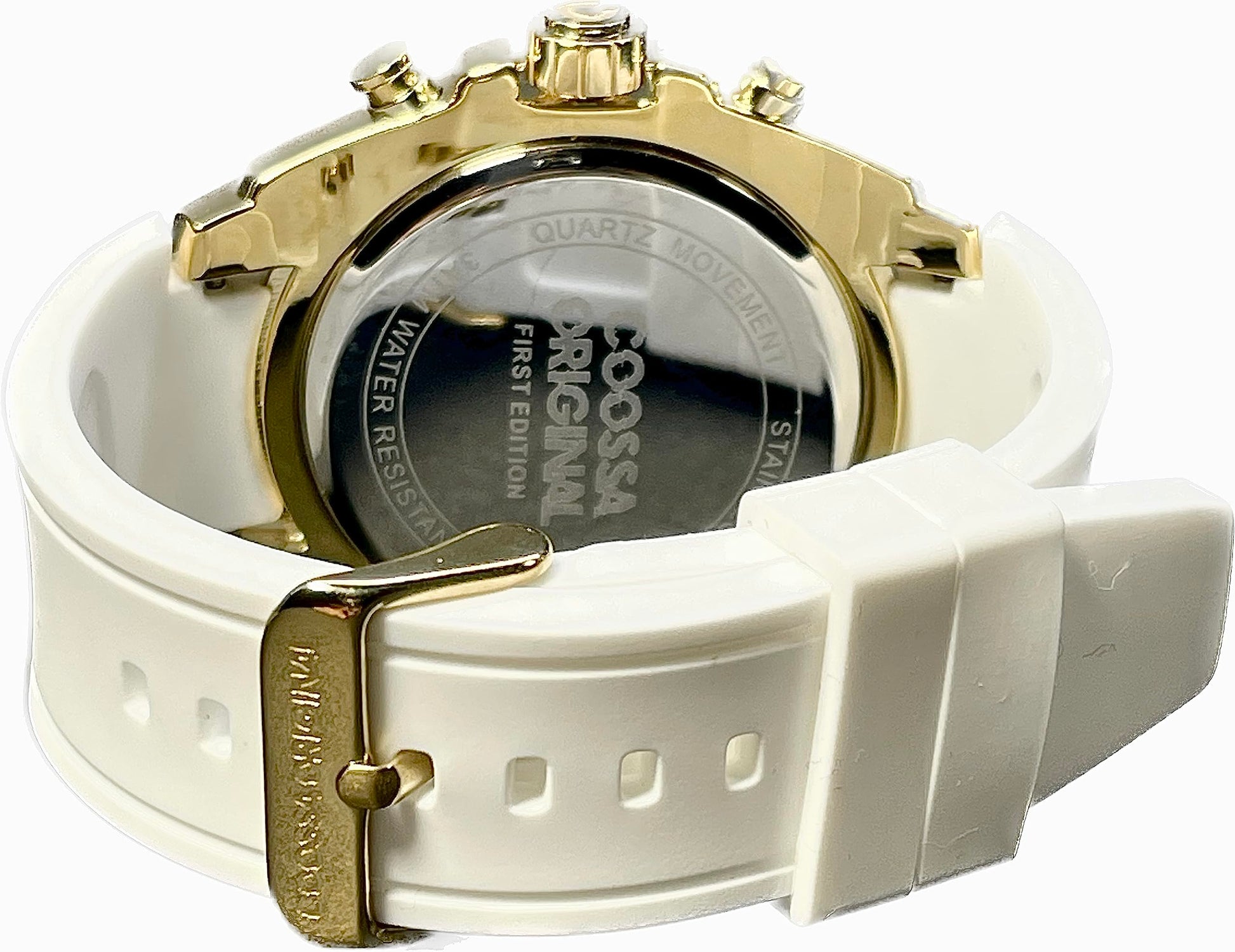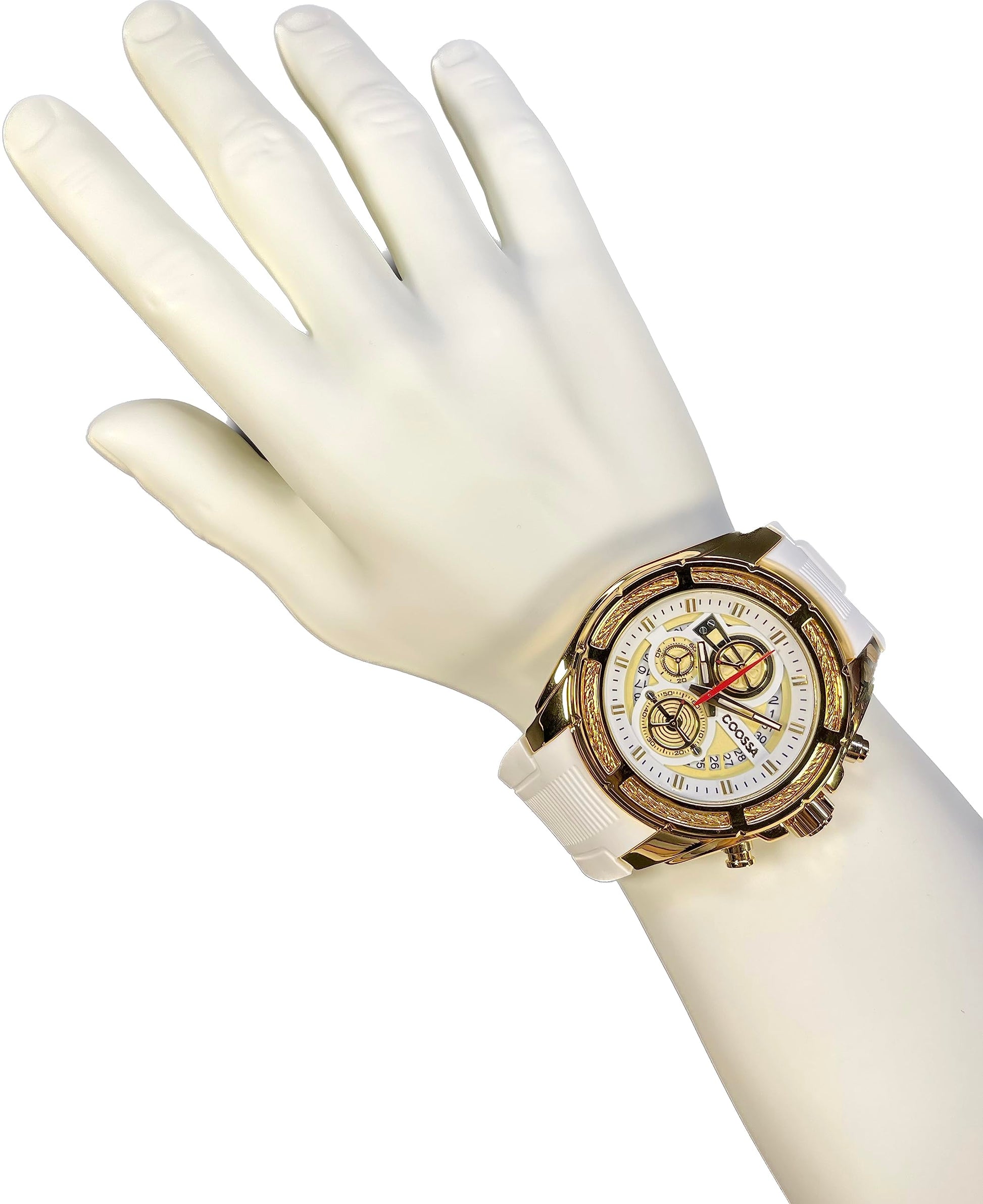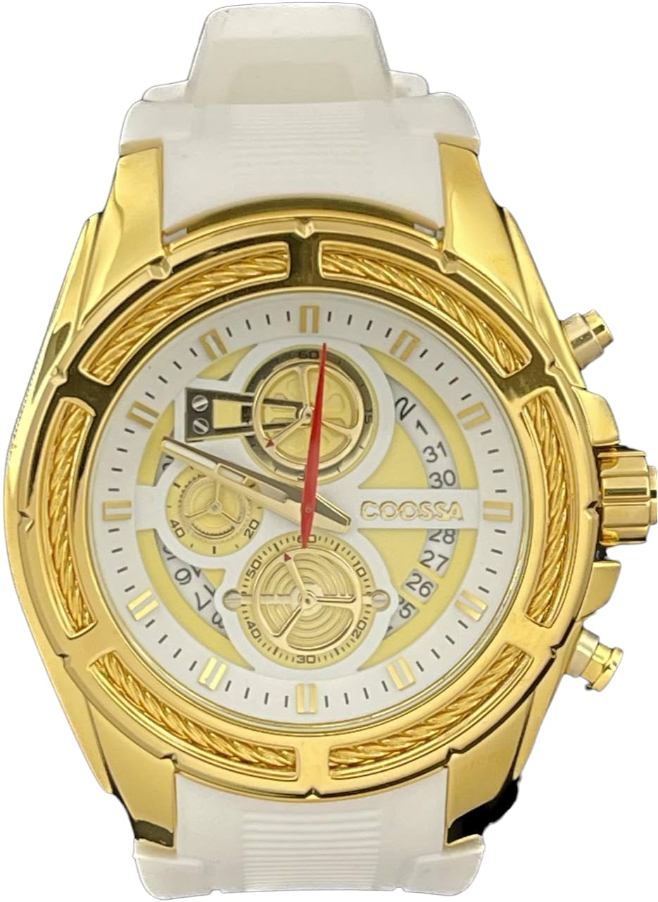 COOSSA ORIGINAL Men's Watch Chronograph 20245 48MM Gold Tone Case White Silicone Band 30M Water Resistant Cable Bezel